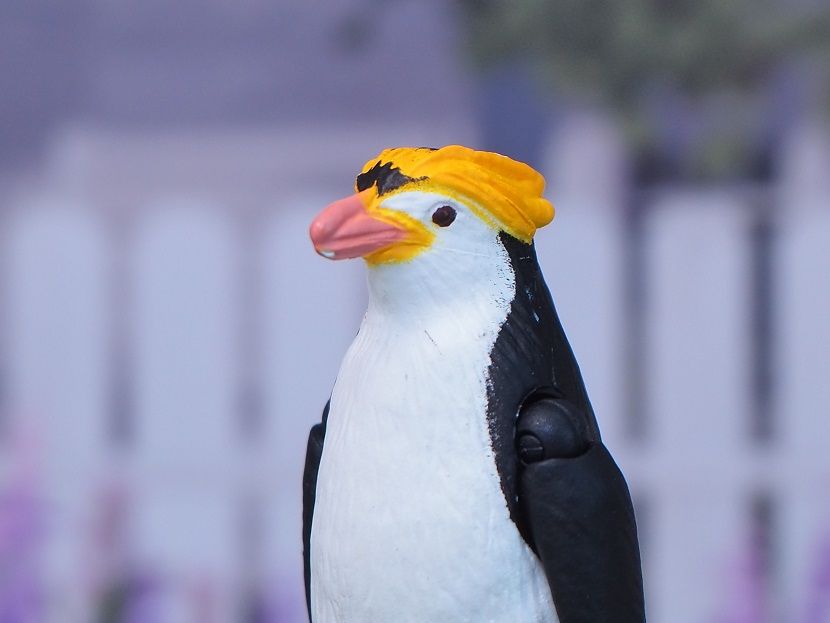 白色の顔に金色の冠羽が特徴的なぺンギン。