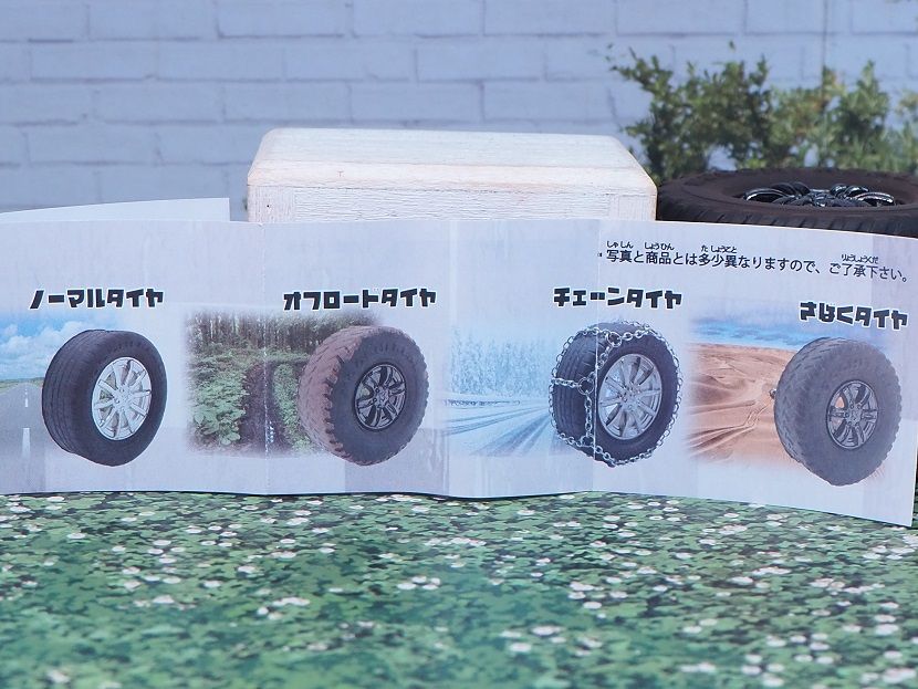 ラインナップは ノーマルタイヤ、オフロードタイヤ、チェーンタイヤ、さばくタイヤ の全4種類で価格は1回300円となっております。