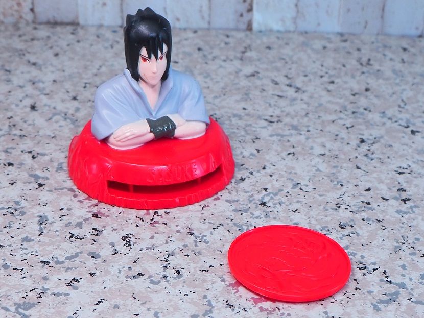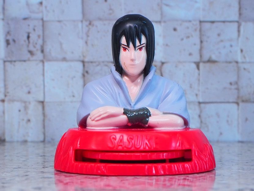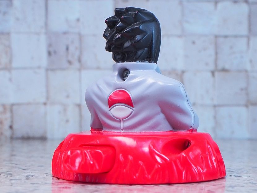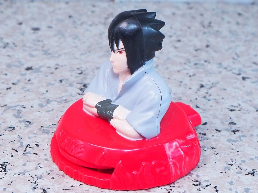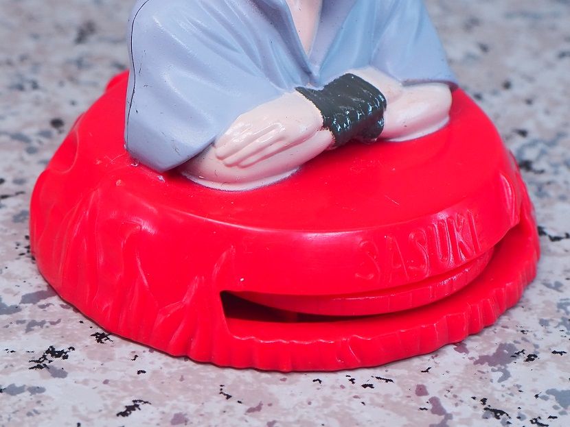 腕を組んだサスケの上半身が謎の台座に乗っているという、またしても変なビジュアルの玩具。