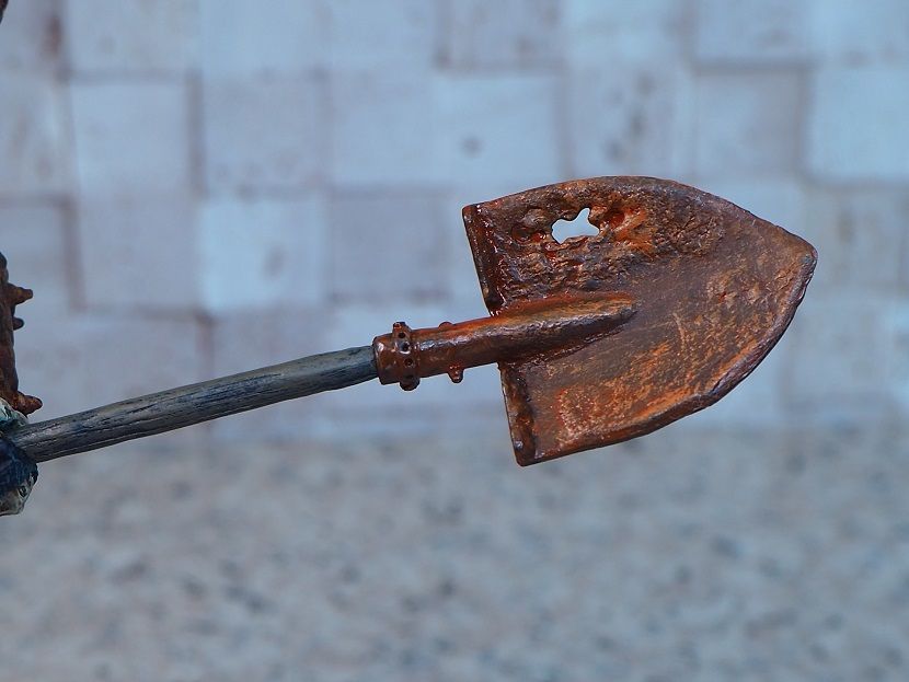 シャベルは柄と先端部で分割されており、腕から取り外すことも可能。