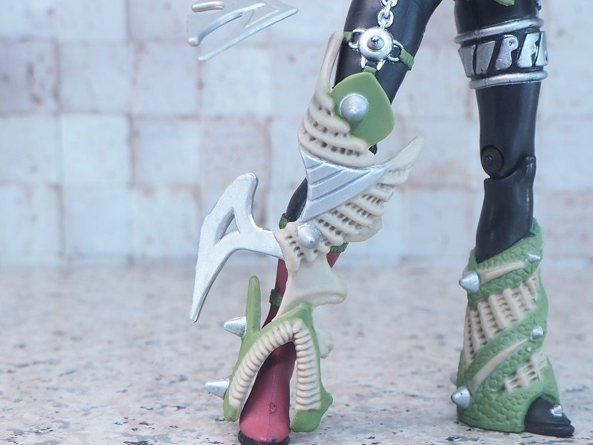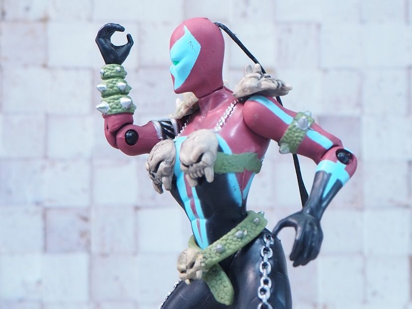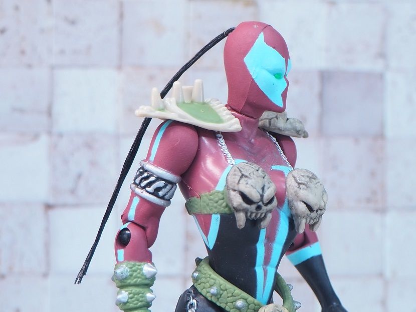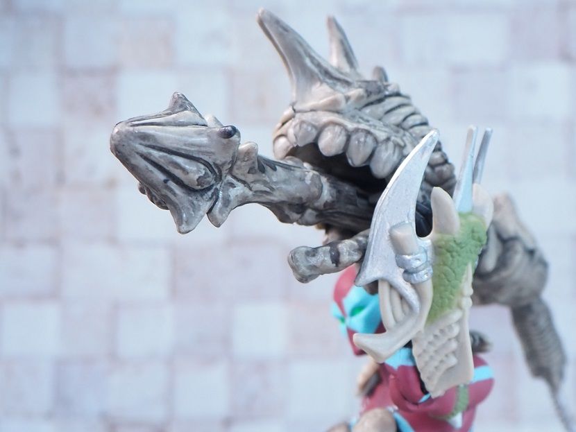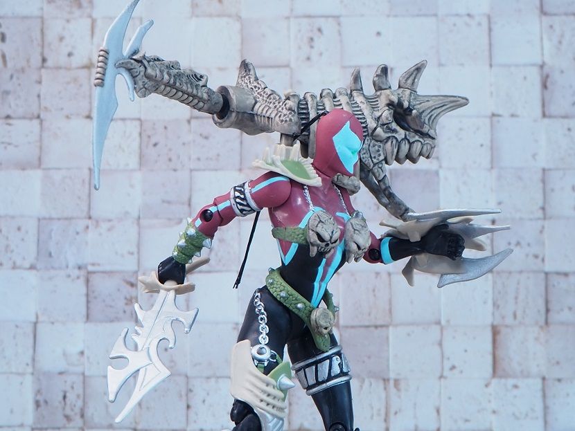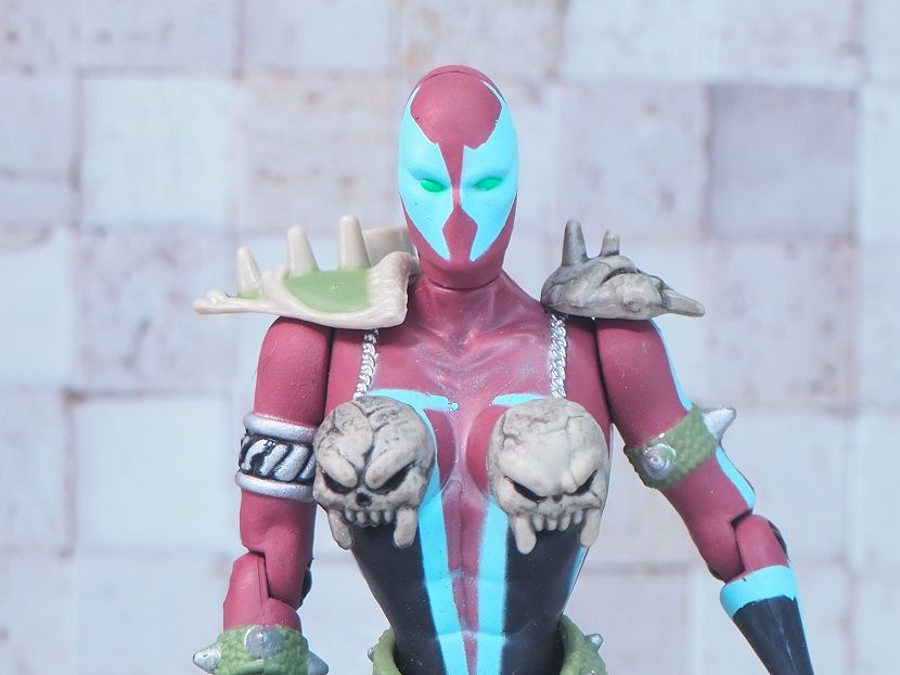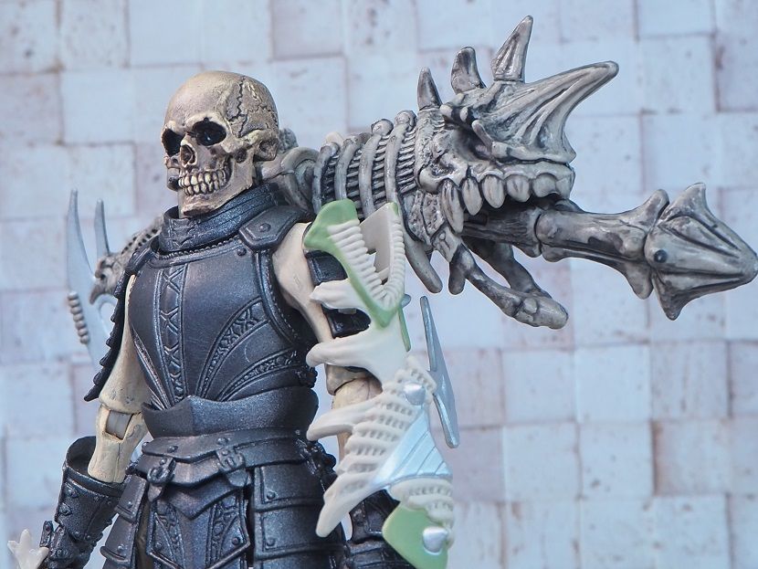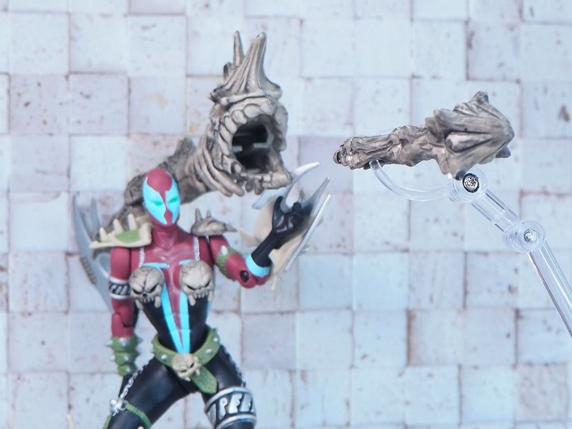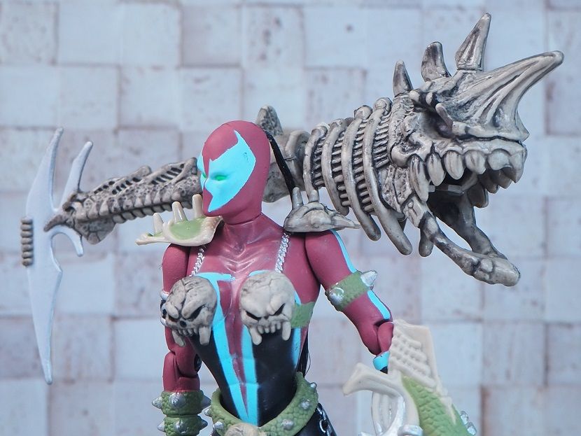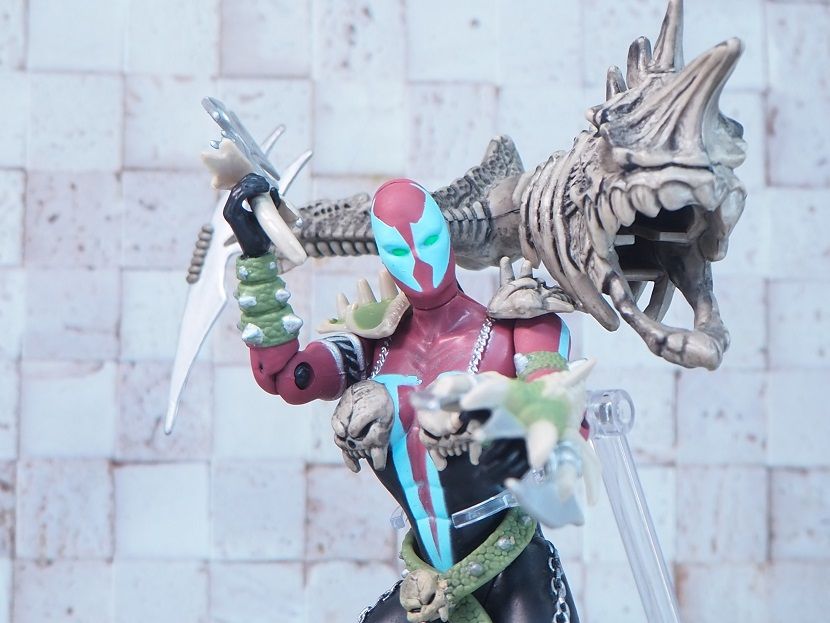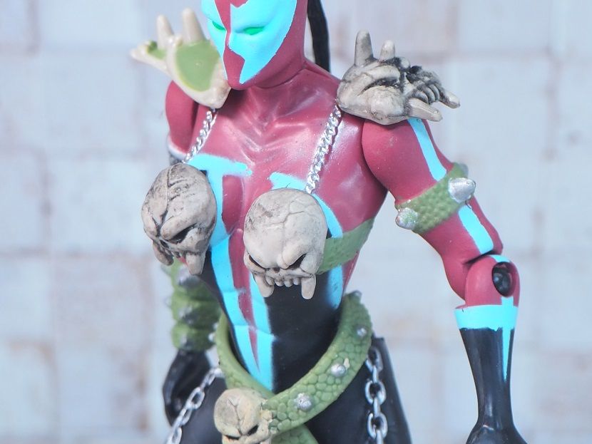 フィギュアの特徴としては肌の色が赤茶、顔等のペイントが青、骸骨等の装飾には黒いウォッシュ塗装が施されております。