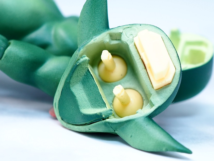 顔の前面パーツを取り外し、目の裏側にある軸を動かすことでゴブリンくんの目線を変えることが可能。