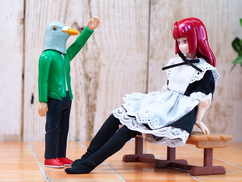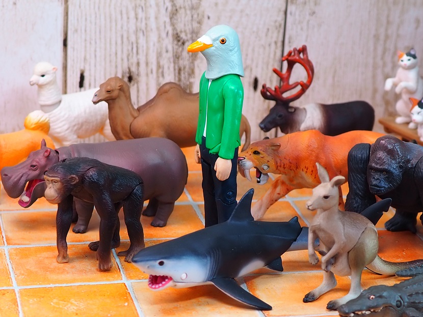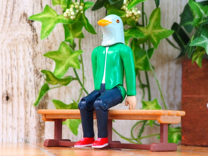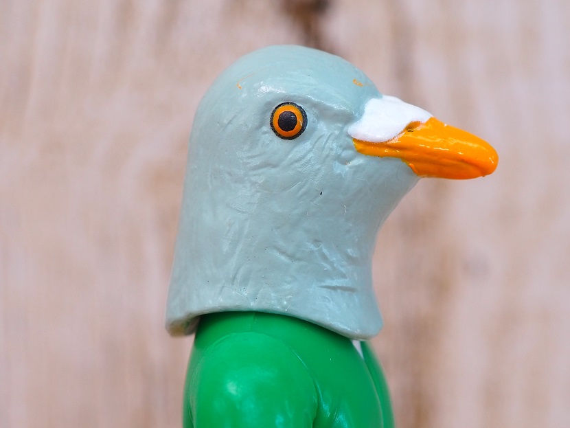 とてもシュールですが・・・はい、ハトの被り物です。