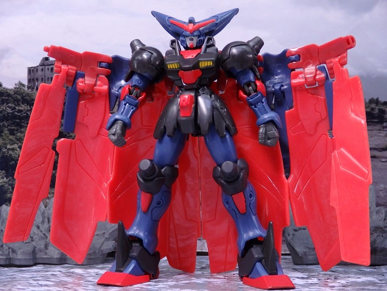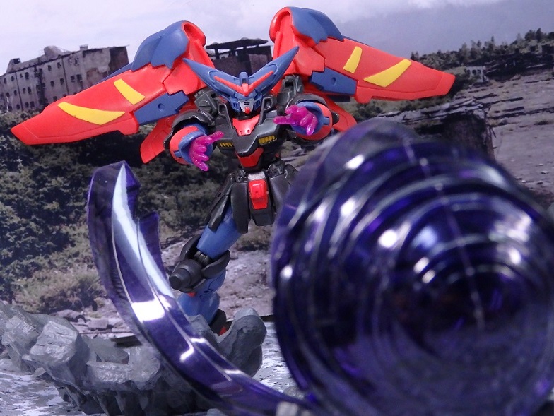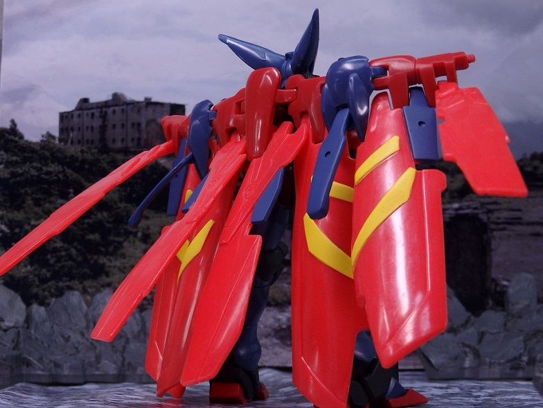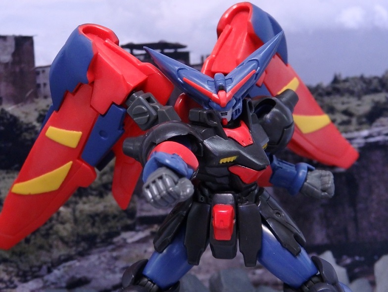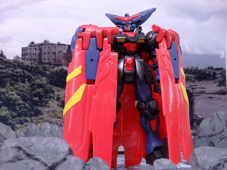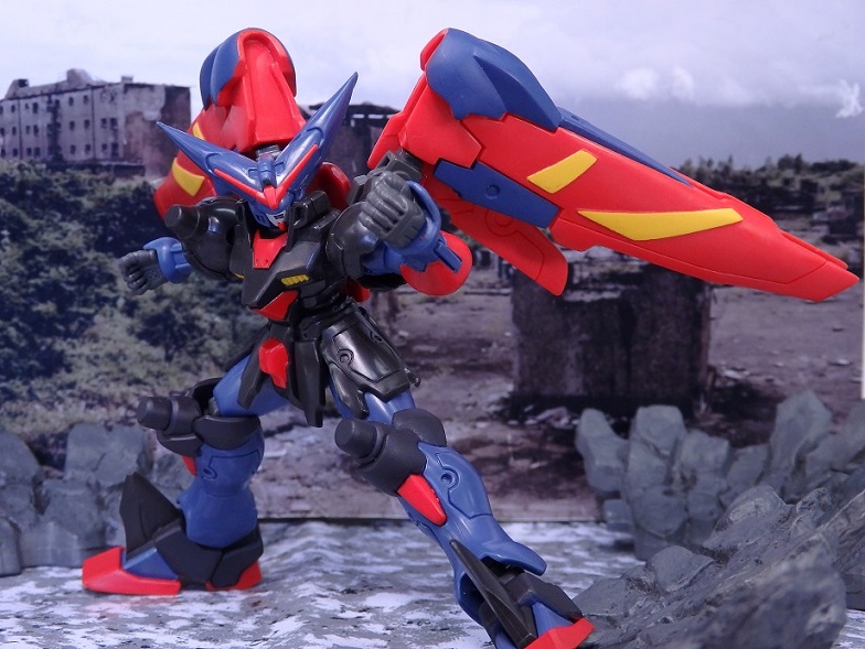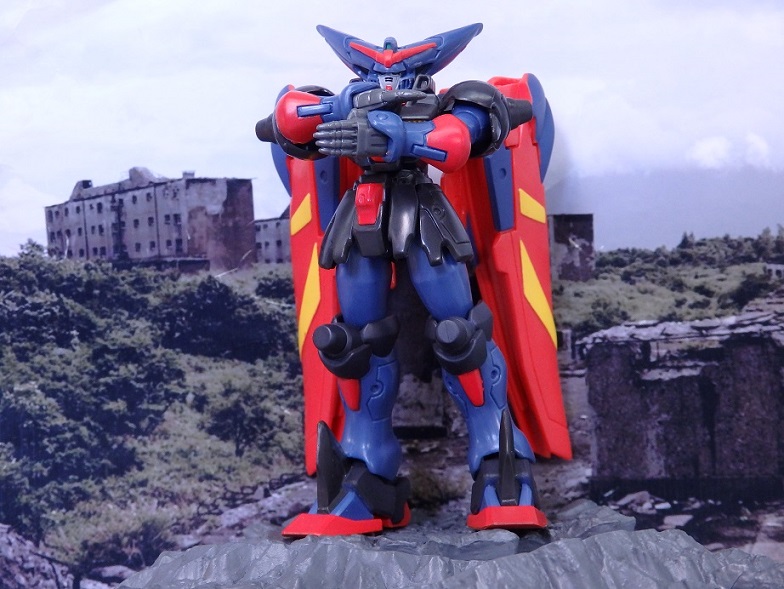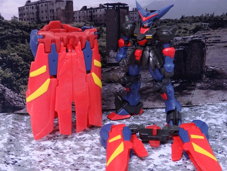 マスターガンダムは背中のウイングシールドが重く転倒しやすいので、うまく乗せるのには一苦労。