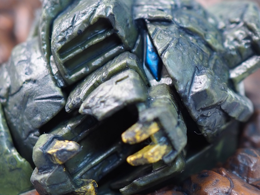 ツインアイやセンサー部はグリーン、アンテナはイエロー、口に当たる部分はレッドで塗装済み。