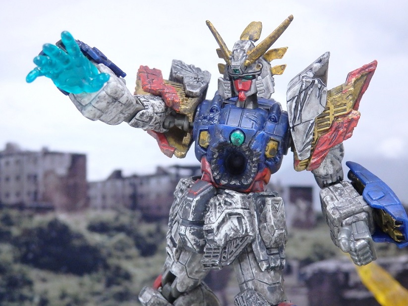 腹部には大胆にもマスターガンダムの右腕がぶっ刺さった状態に。