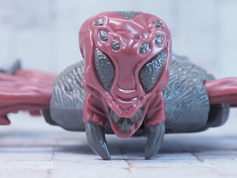スパイダーマンのマスクを象りながらも口横には大きなキバのようなものが生えています。