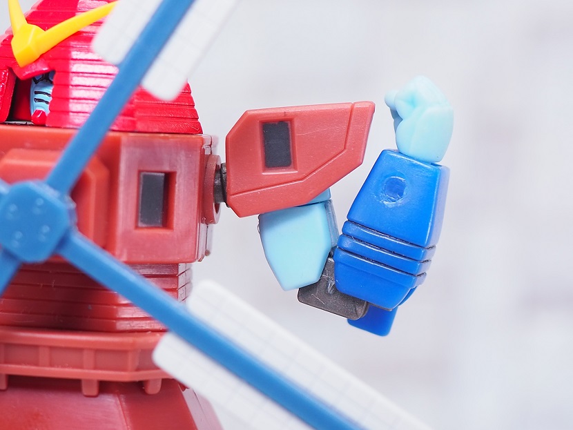肘は「二重関節」になっているんですが、腕を動かすと手前のプロペラとぶつかるので可動域は狭め。