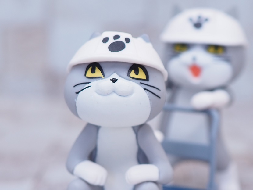 そうそう、こちらの仕事猫は他の猫と違って頭にヘルメットをかぶっていますね。