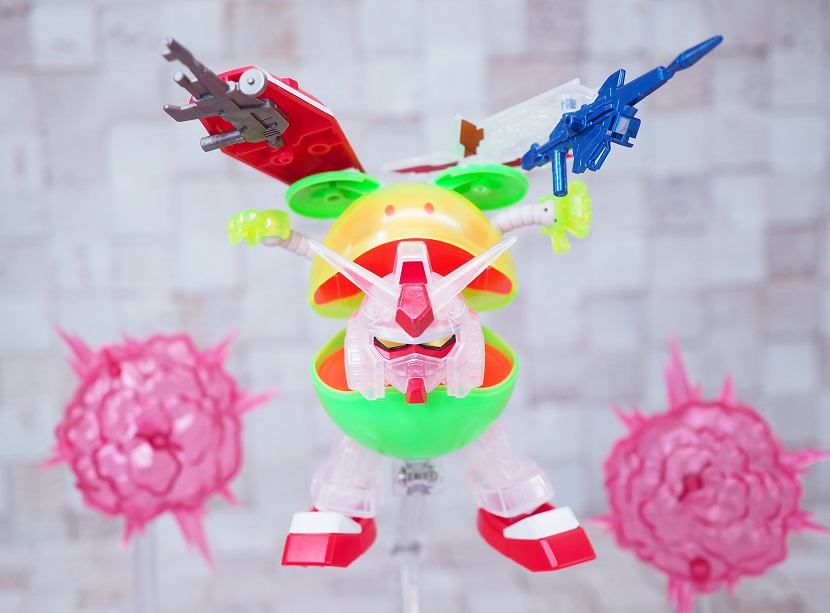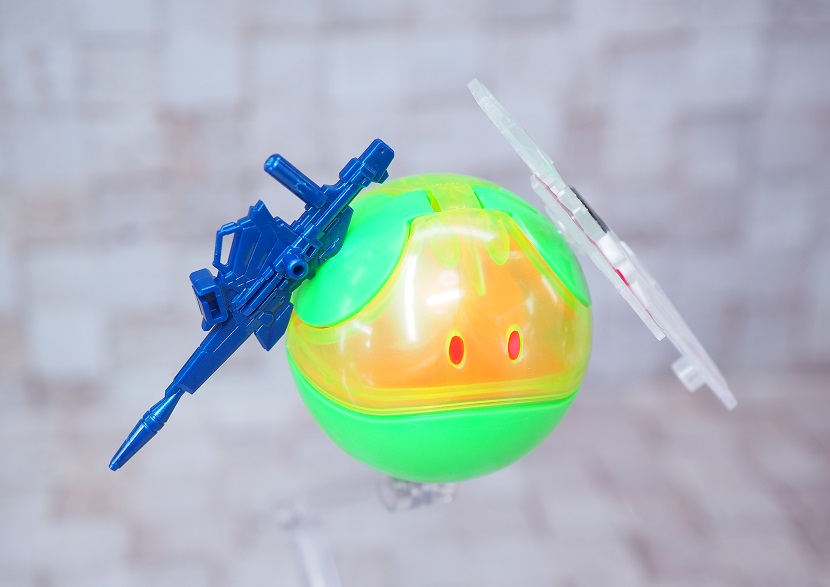 ハロのハンド部には3mmの溝が設けてあるので、SDガンダム等の武器なら持たせることが可能。