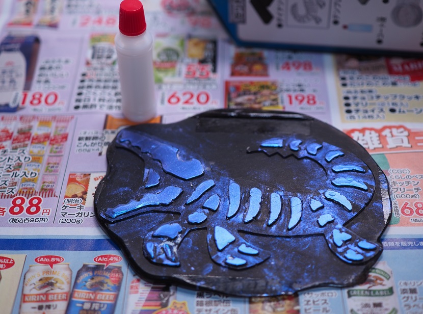 こちらはメタリックカラーの恐竜骨格風レリーフを作る事ができる工作キットとなっております。
