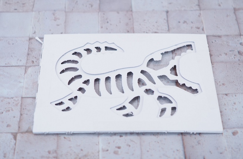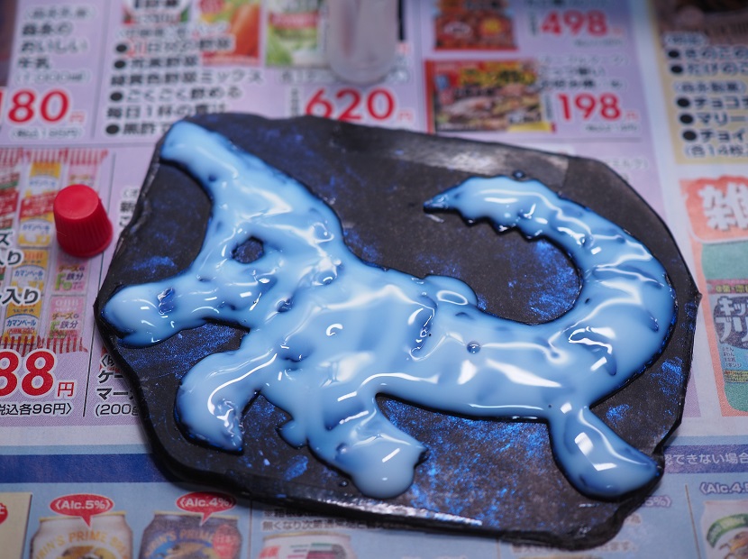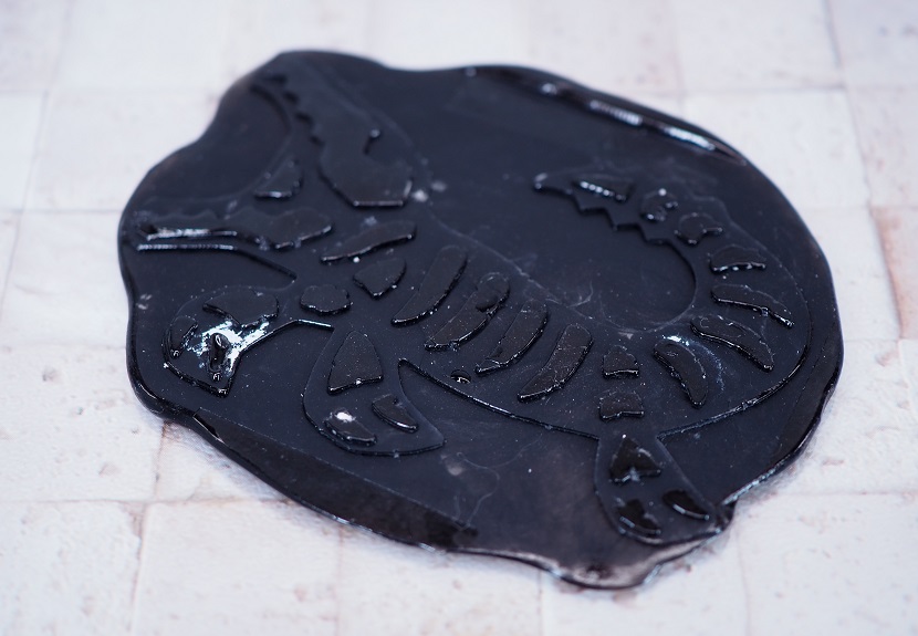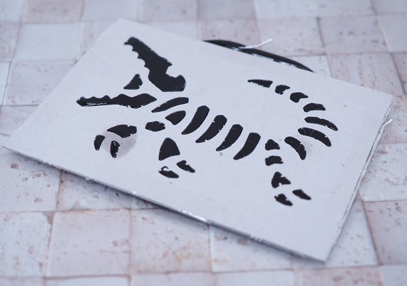 テンプレートの上に ダイナソーのもと を乗せ、骨の形に沿って満遍なく押し当て広げていきます。