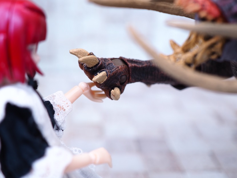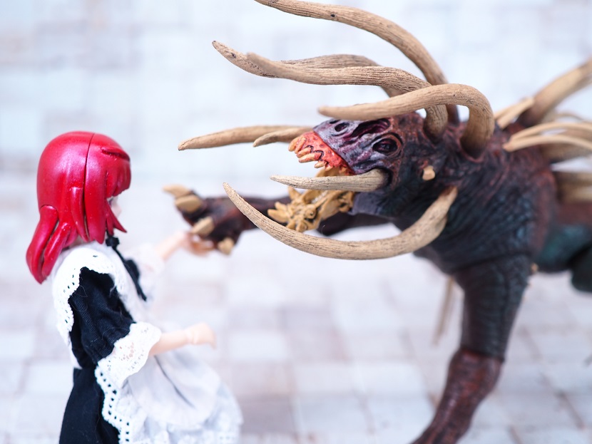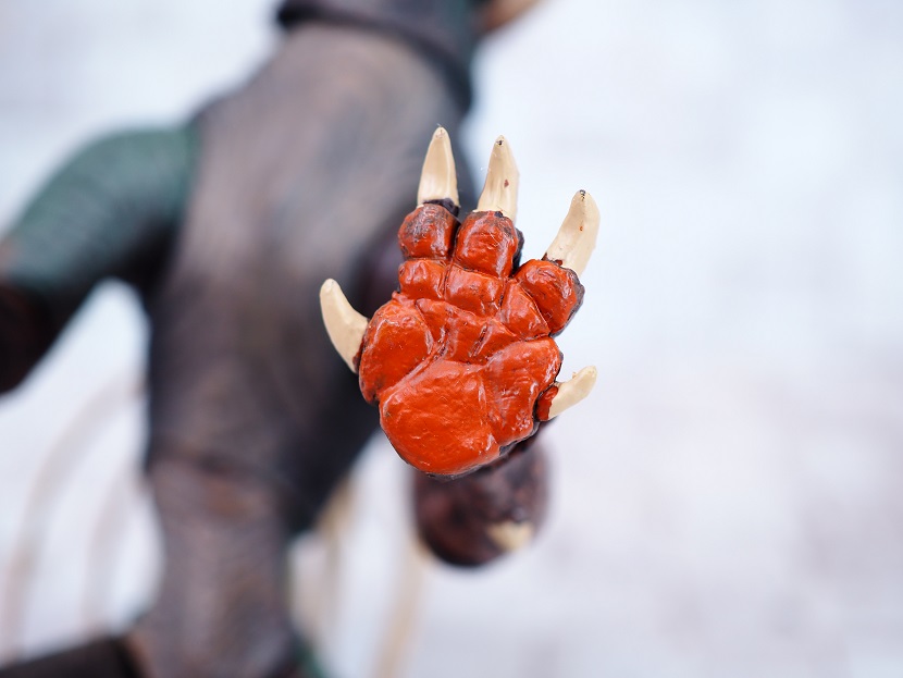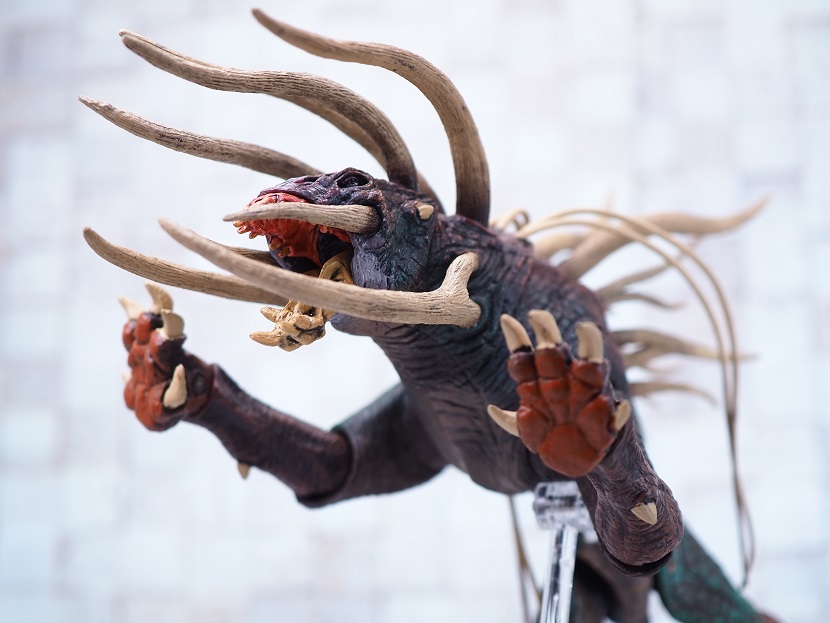 目はつぶらな瞳なんですが、正面顔はただれたような皮膚のような造形がかなり禍々しい感じ。