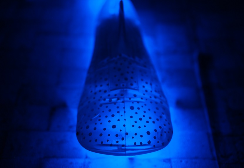 クリアライトブルーの外装で目はブラック、お腹はホワイトの塗装。