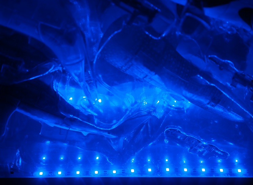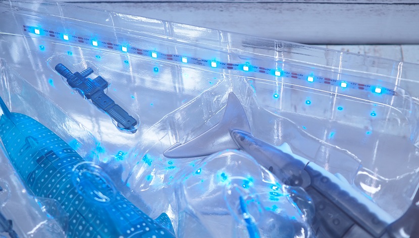 ブリスター内に電池ボックスがあり、電源スイッチのオン オフでパッケージの中を青く点灯させることが出来ます。