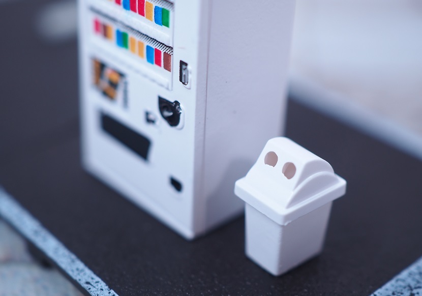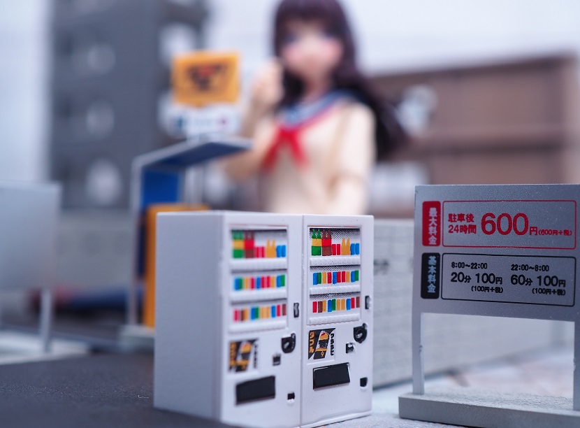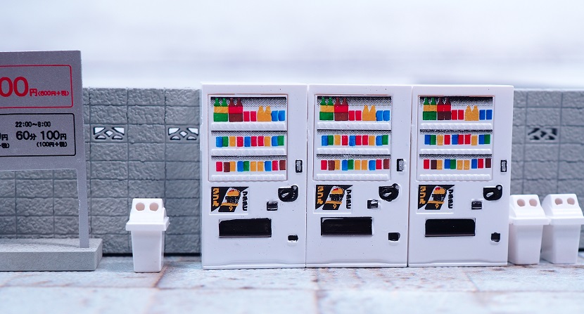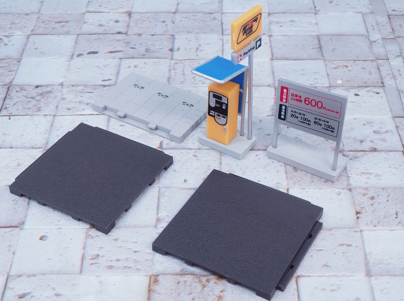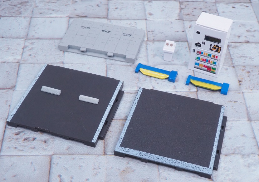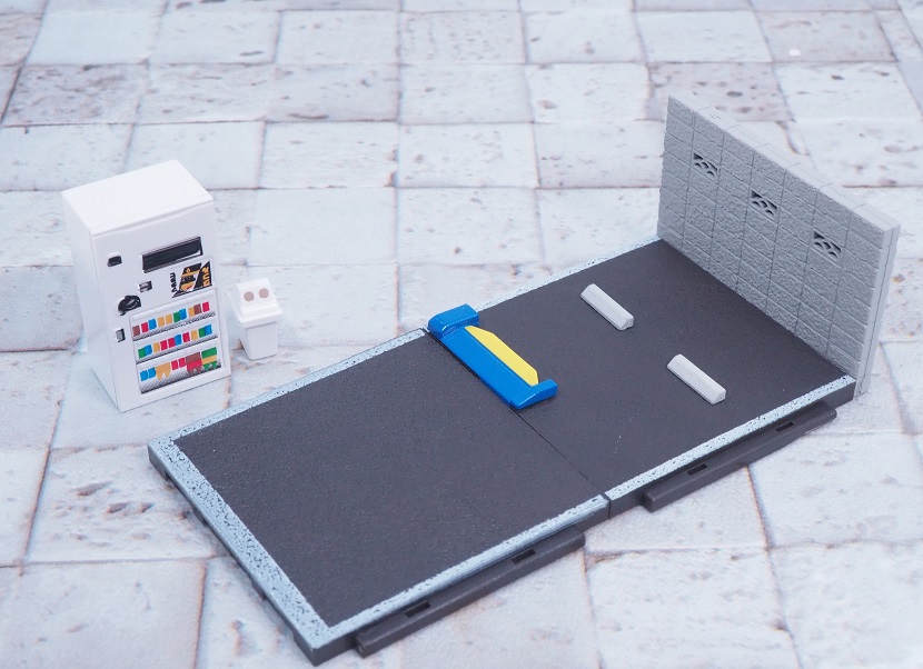 ブロック塀、床板プレート、車止めブロック、フラップ板(開)、フラップ板(閉)、自動販売機、ゴミ箱の7アイテムセット。