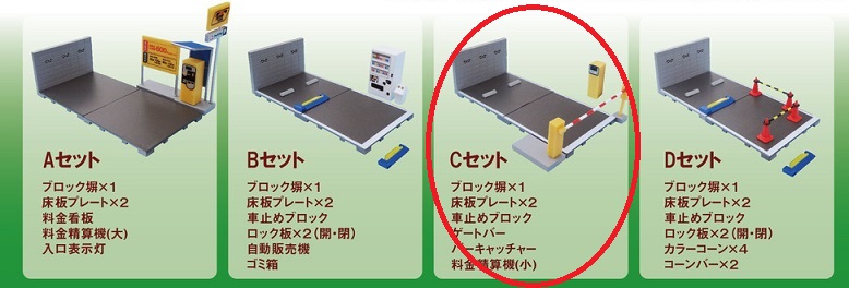 ブロック塀、床板プレート、車止めブロック、フラップ板(開)、フラップ板(閉)はBセットと同じ。