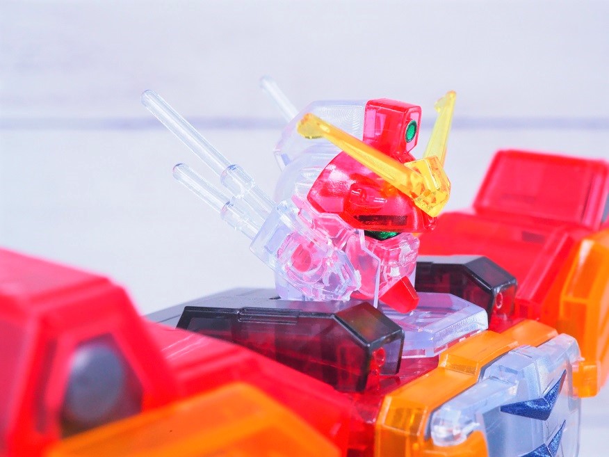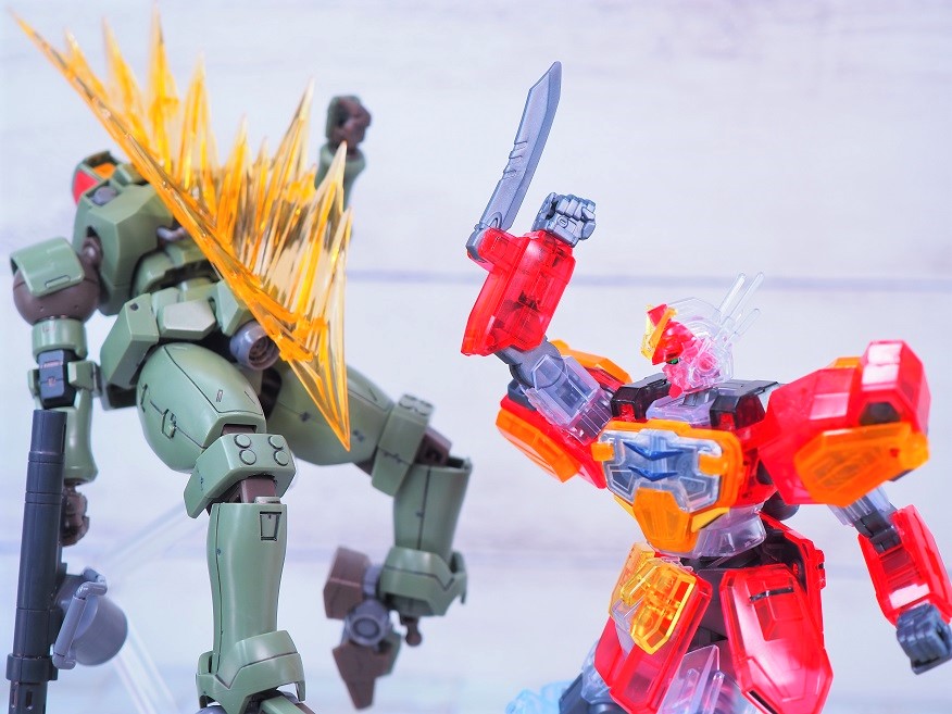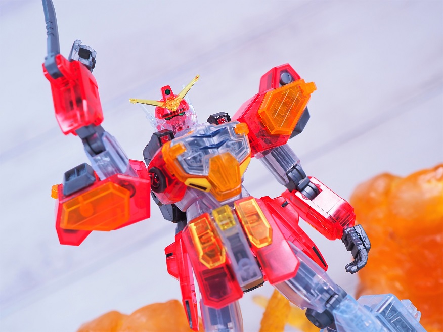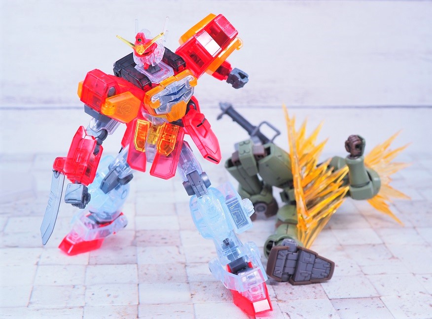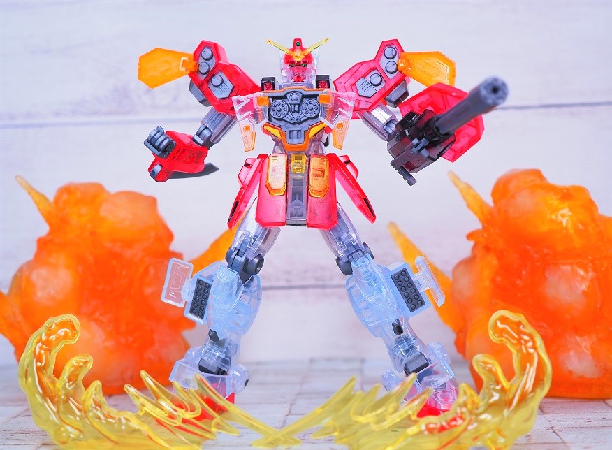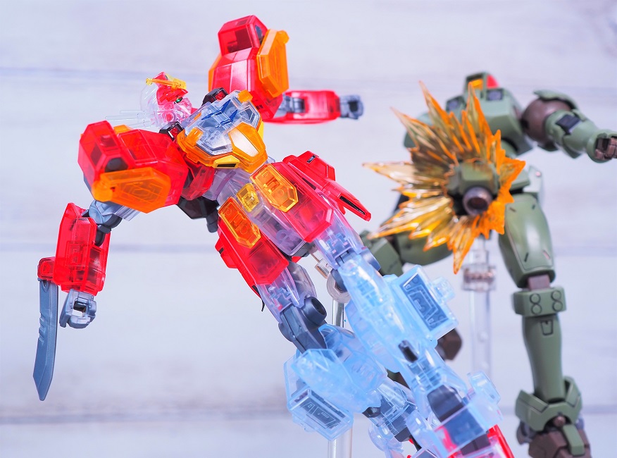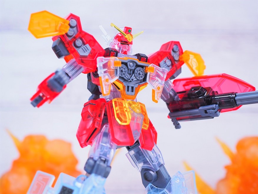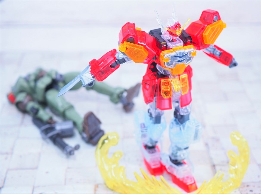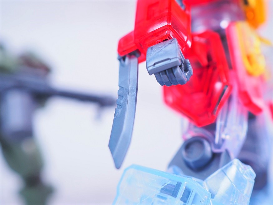 外装パーツがクリア成形になっており、硝煙の中で薄っすらと浮かび上がるMSのような見た目になっています。