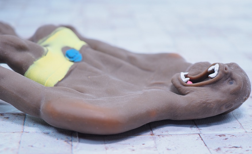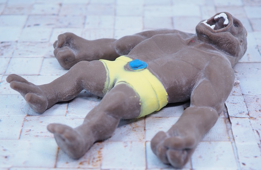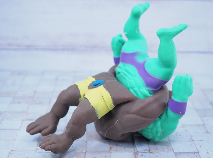 フィギュアはゴムのような柔らかさで、開封時はくっつき防止のため全身に粉が付いています。