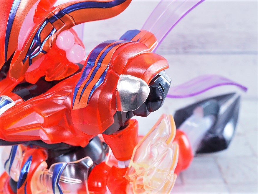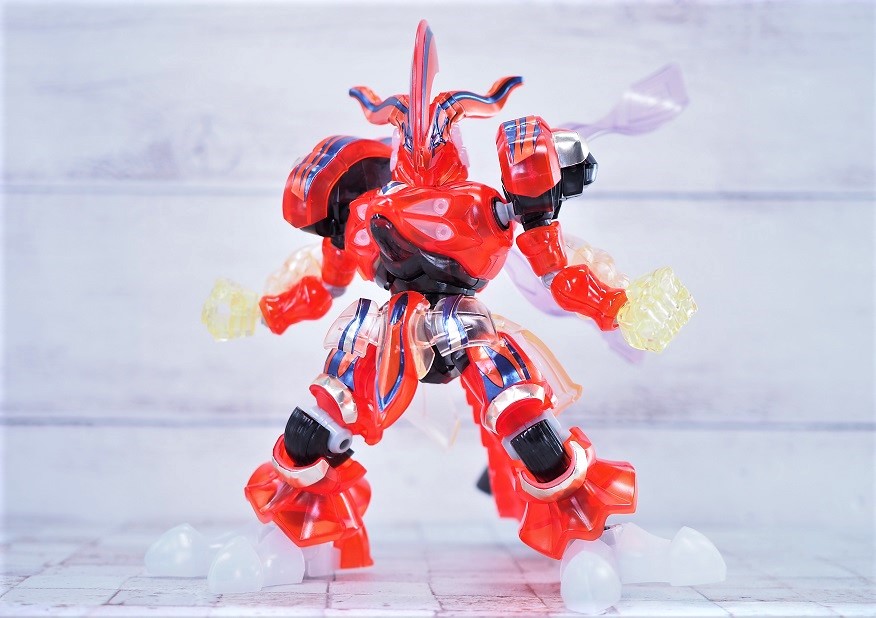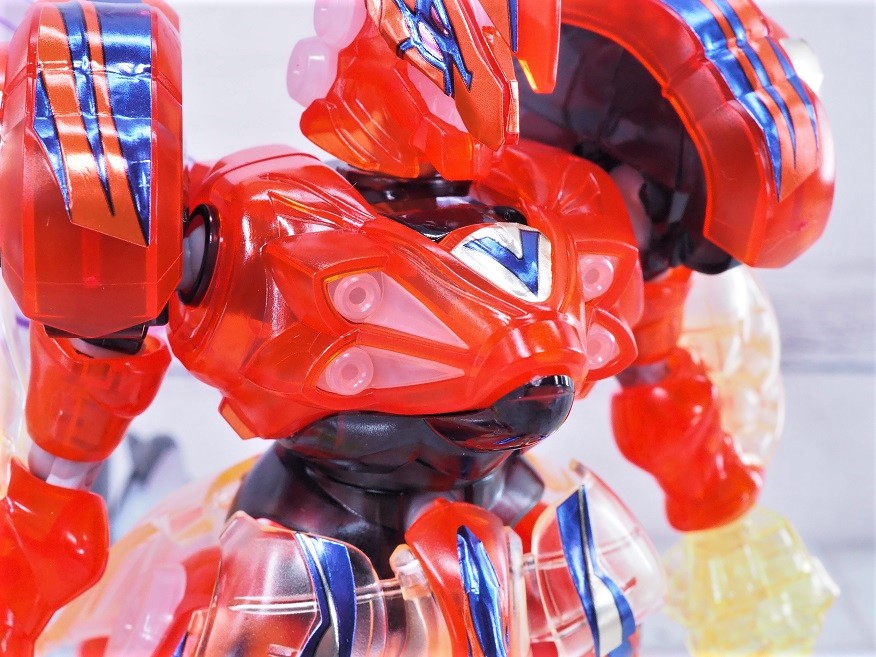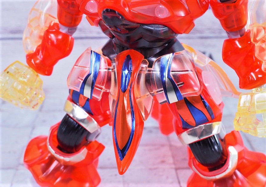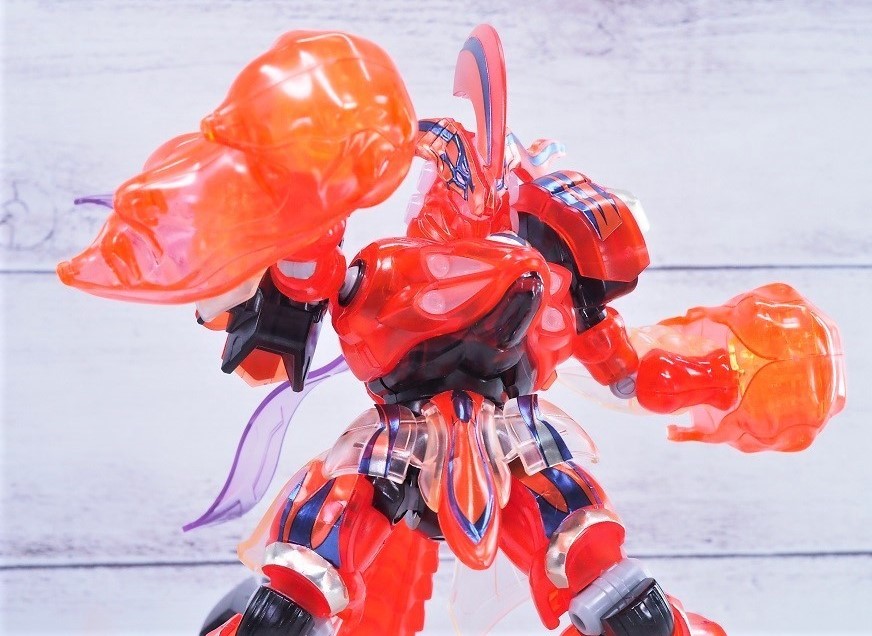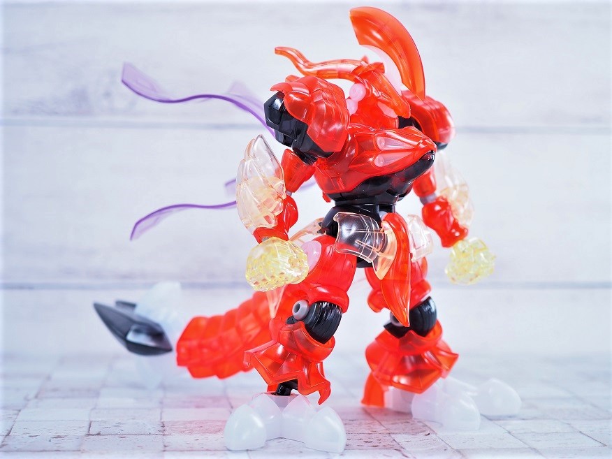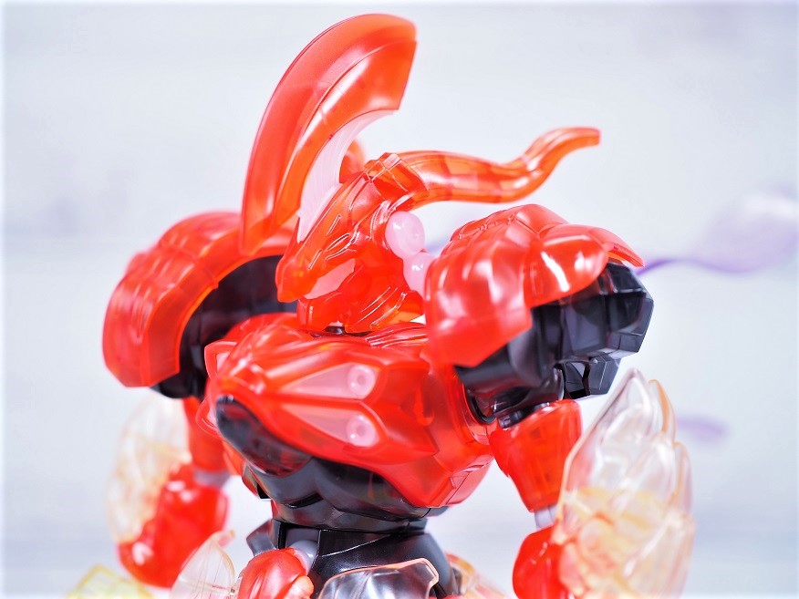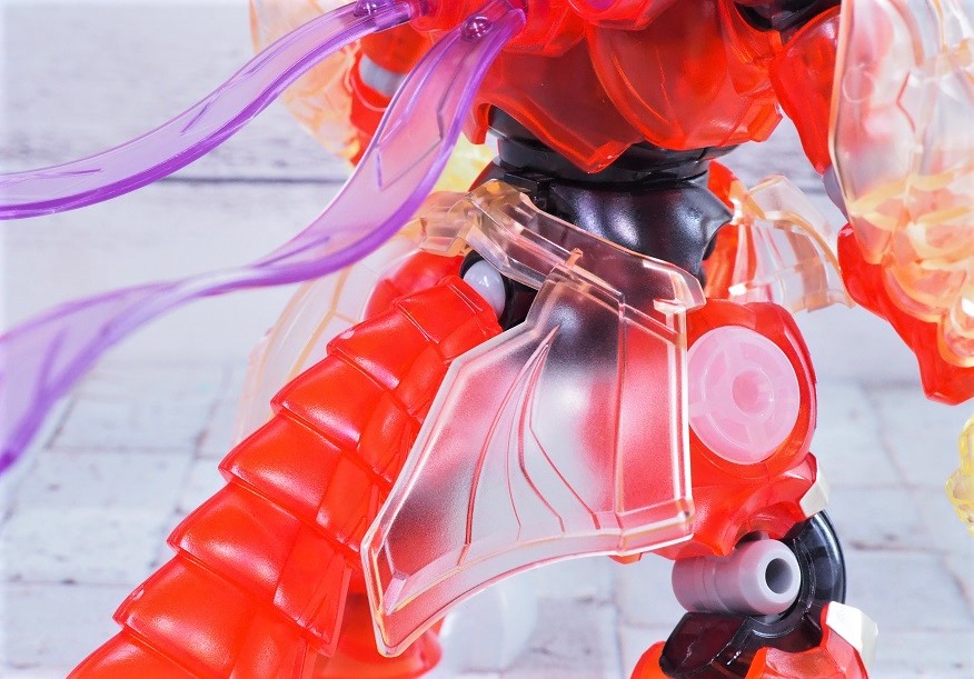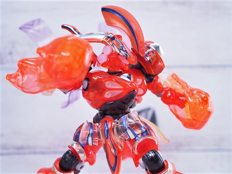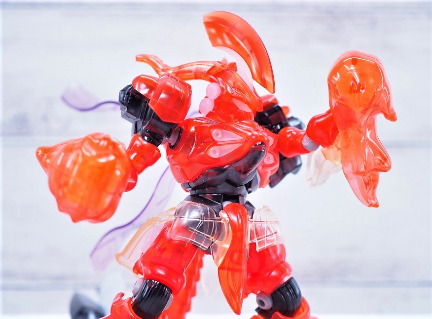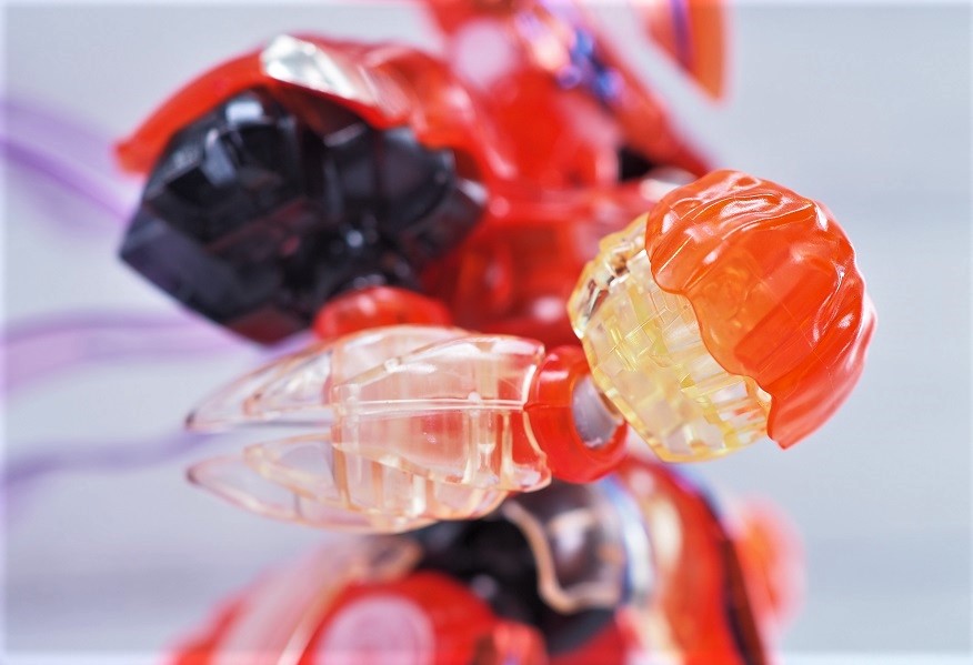 関節のポリキャップ以外はすべてクリアパーツ化されており、内部から熱を放出するかのような赤みの強い色合いになっています。