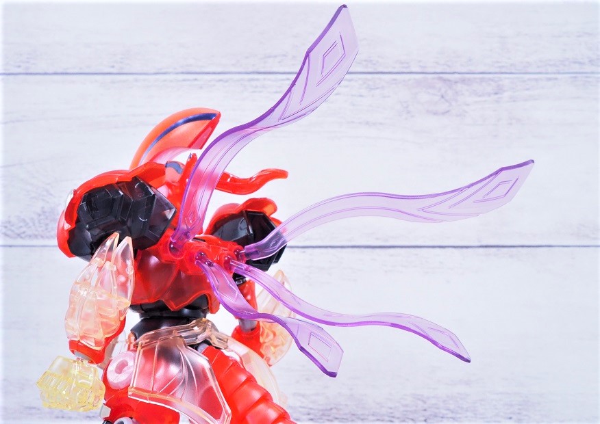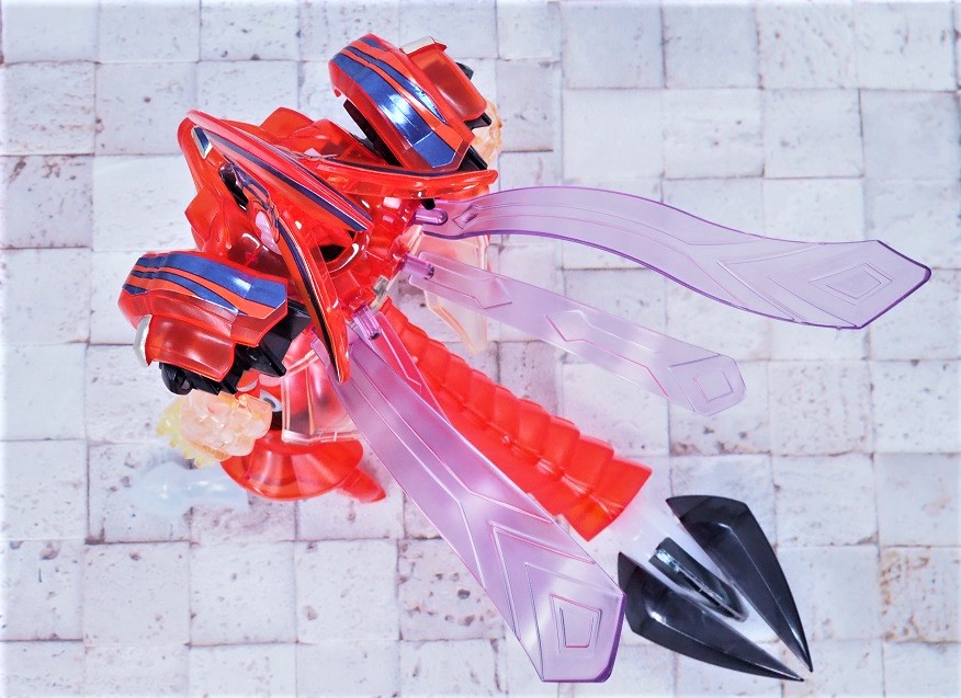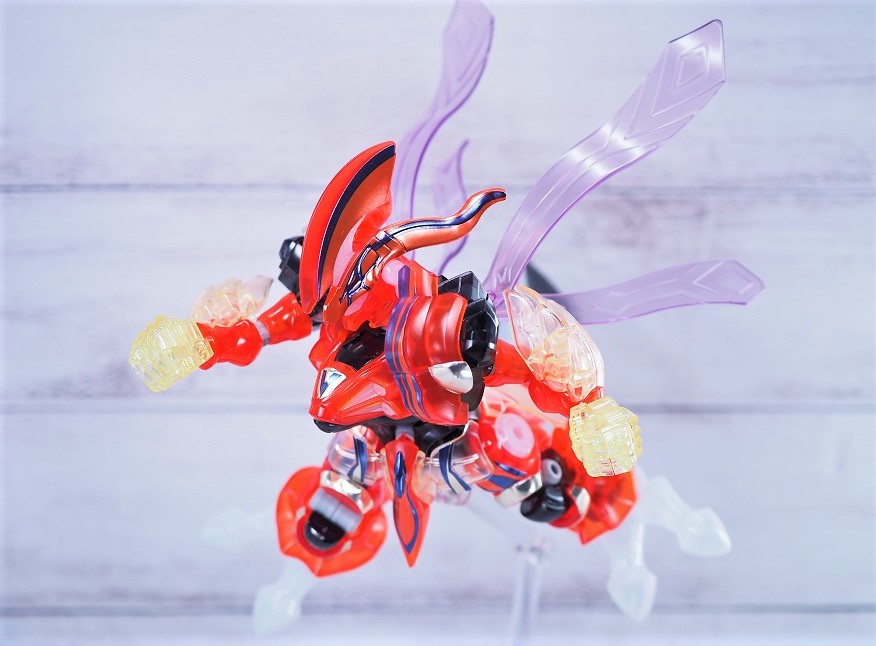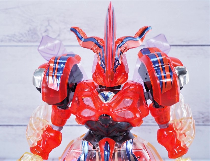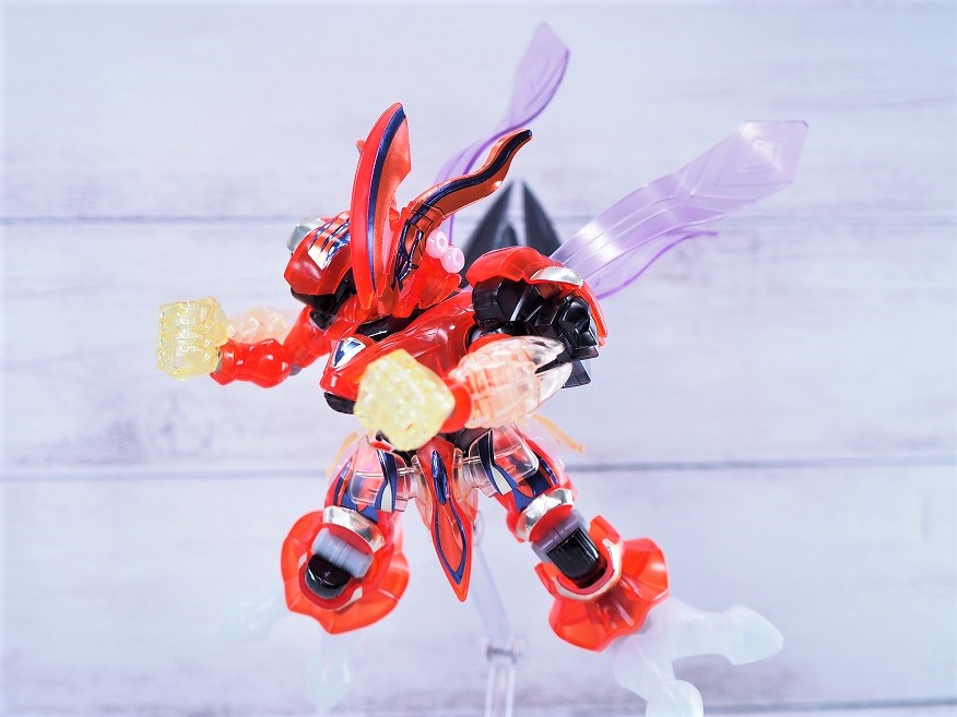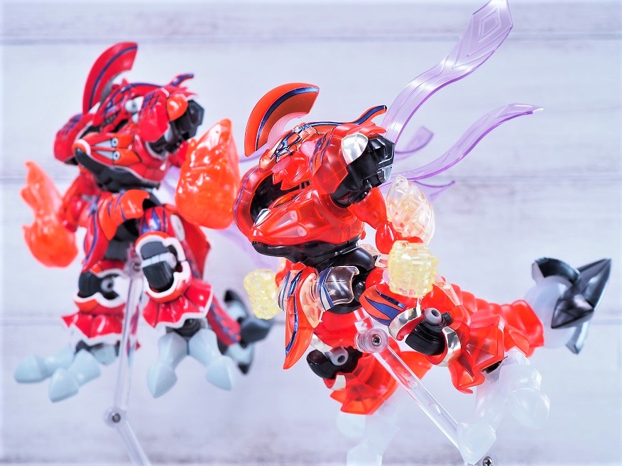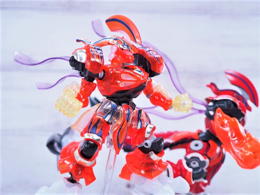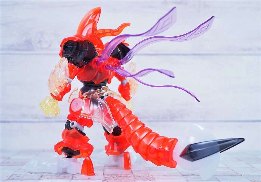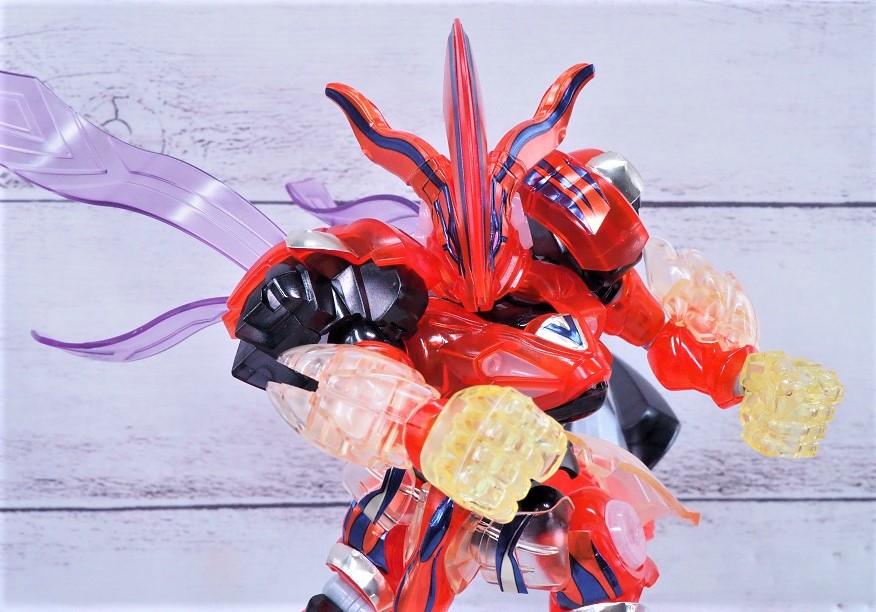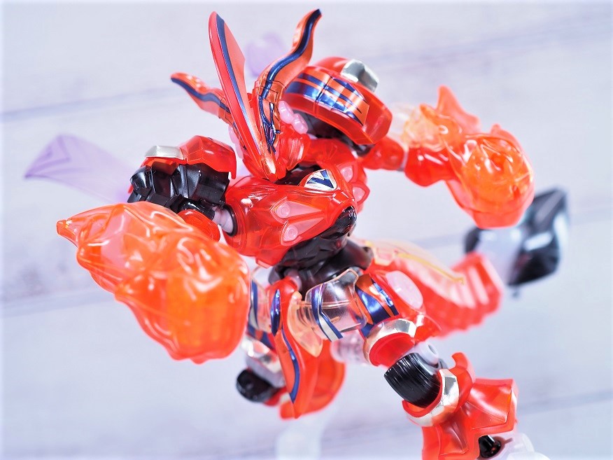 関節のポリキャップ以外はすべてクリアパーツ化されており、内部から熱を放出するかのような赤みの強い色合いになっています。