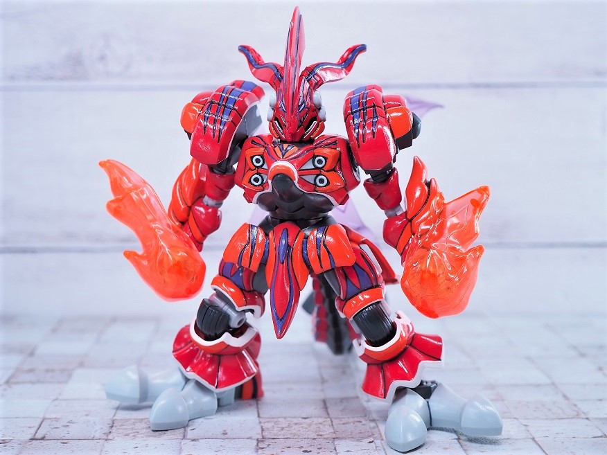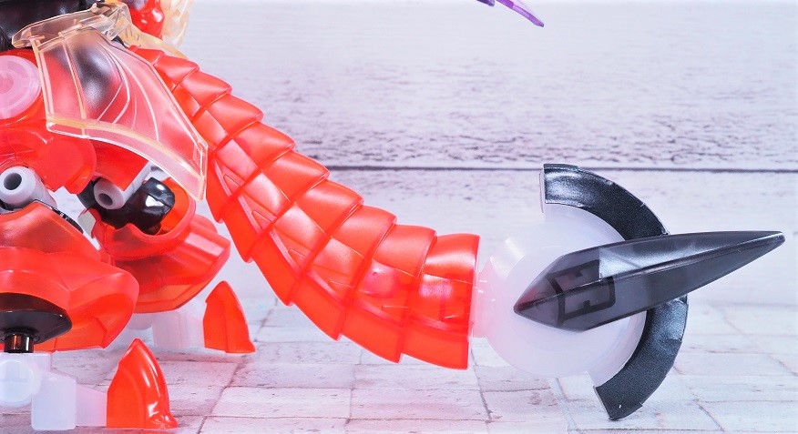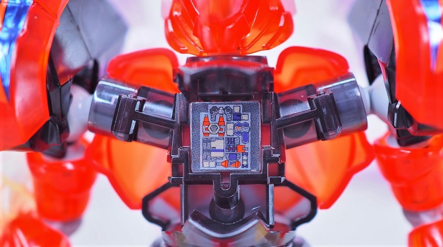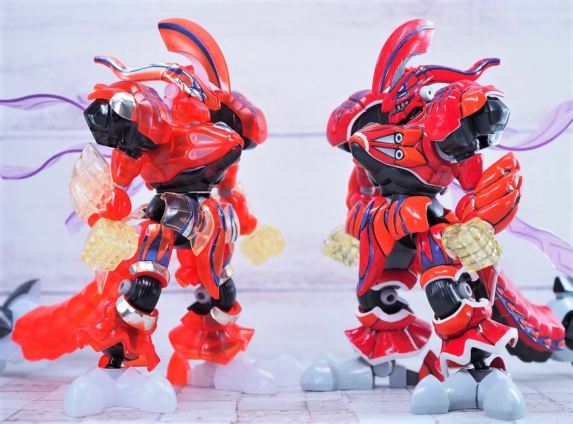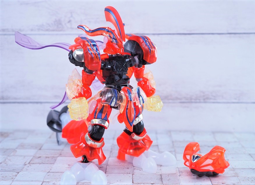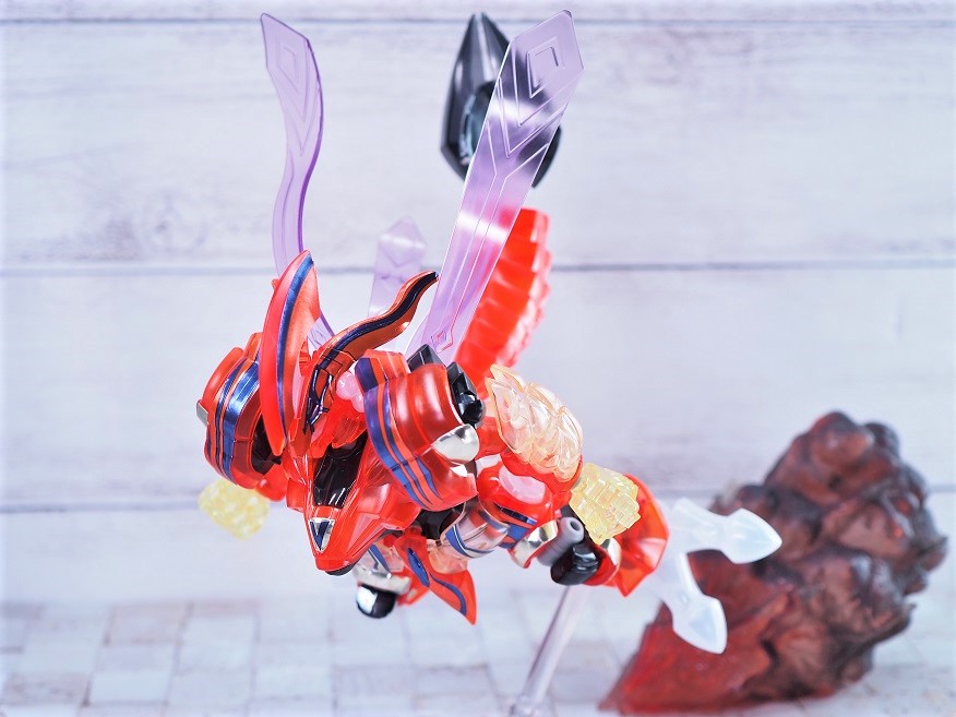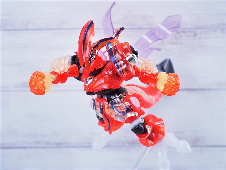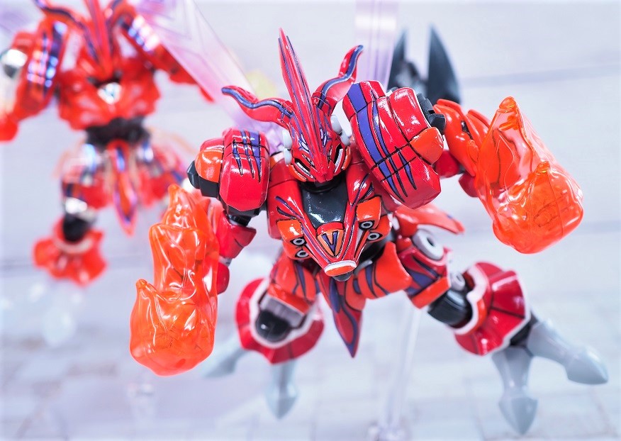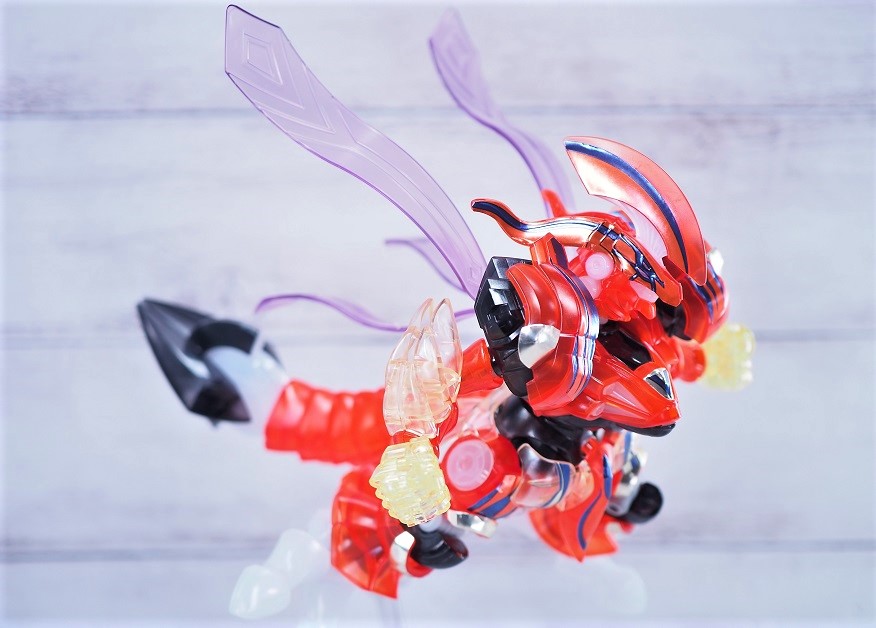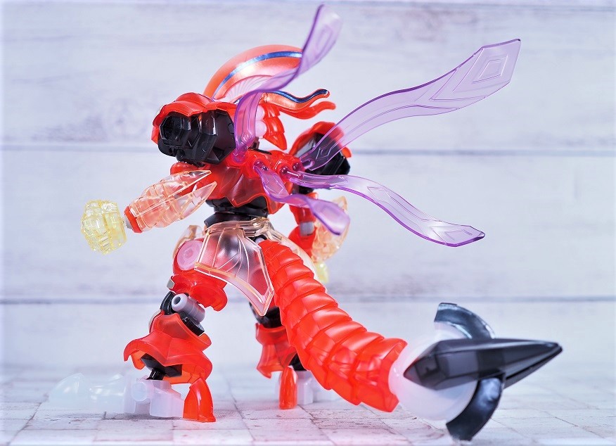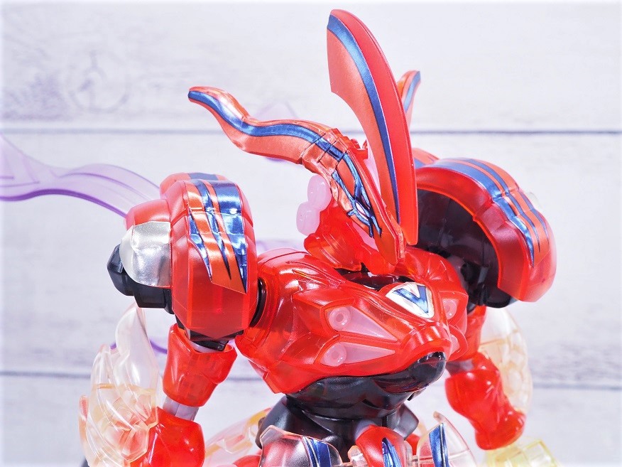 関節のポリキャップ以外はすべてクリアパーツ化されており、内部から熱を放出するかのような赤みの強い色合いになっています。