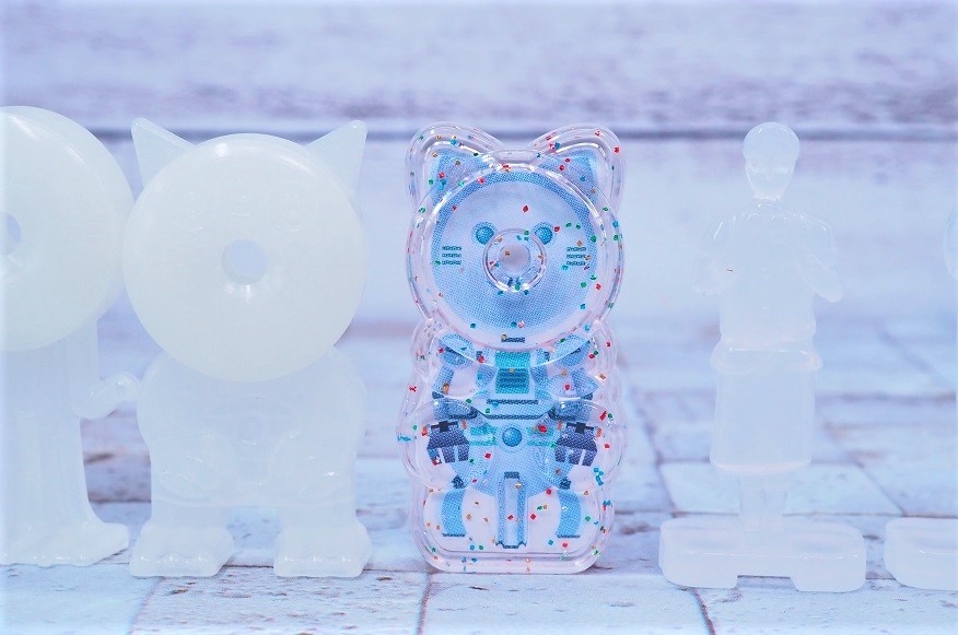 外装はラメ入りのクリアパーツで内部にロボ的なイラストが描かれた紙が入ってます。