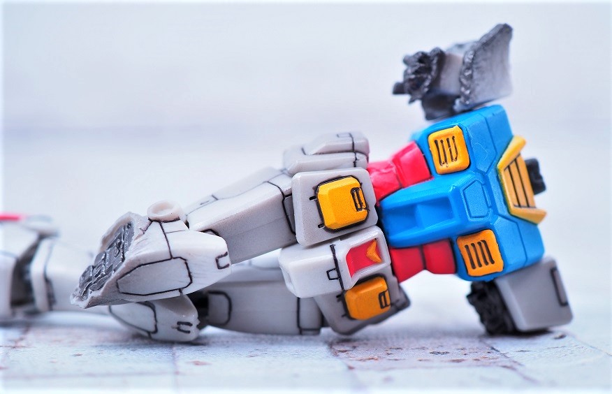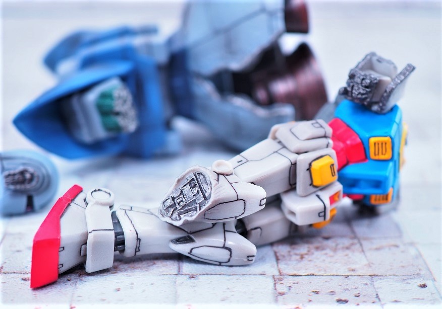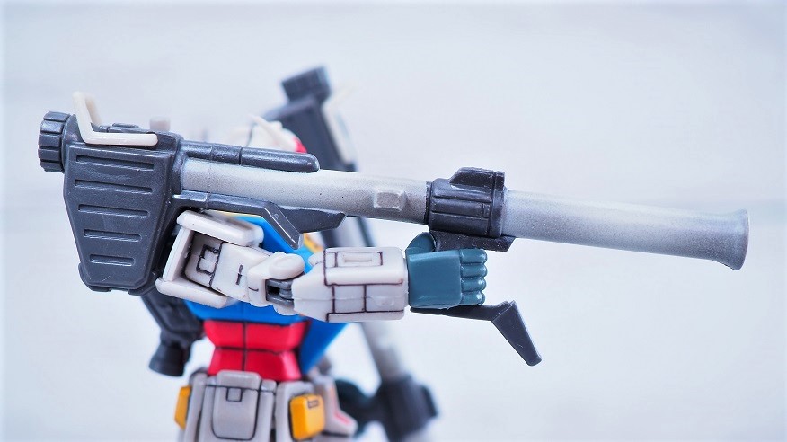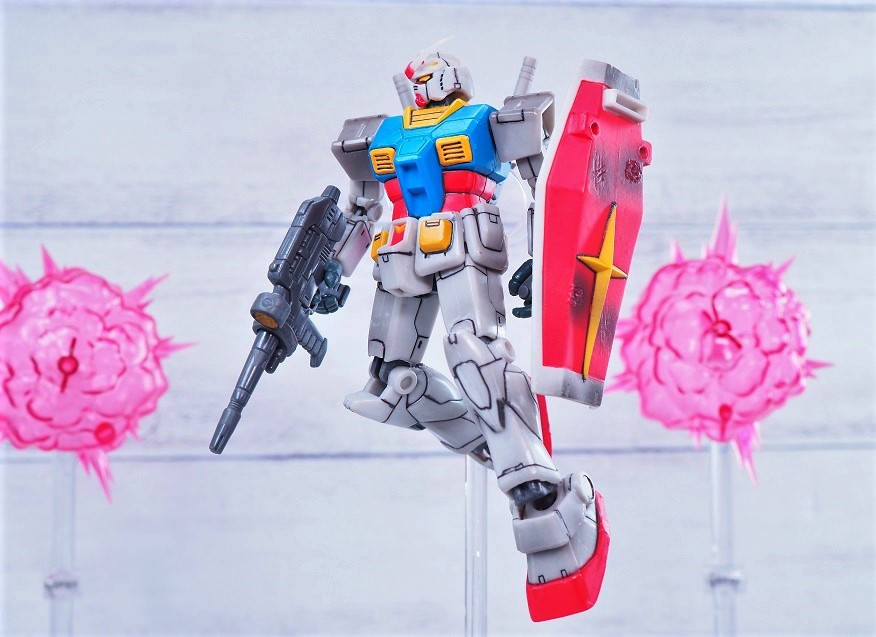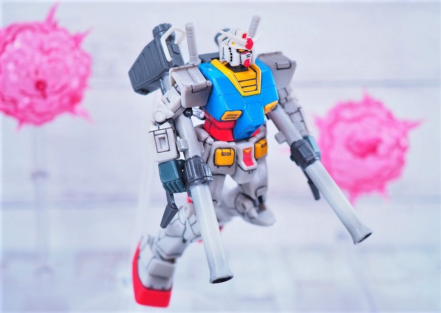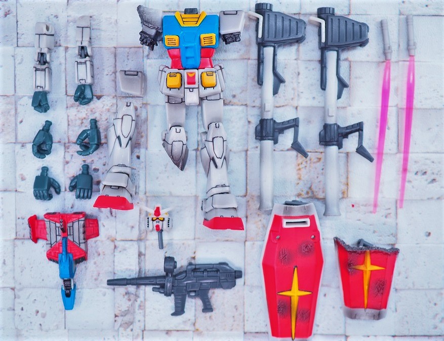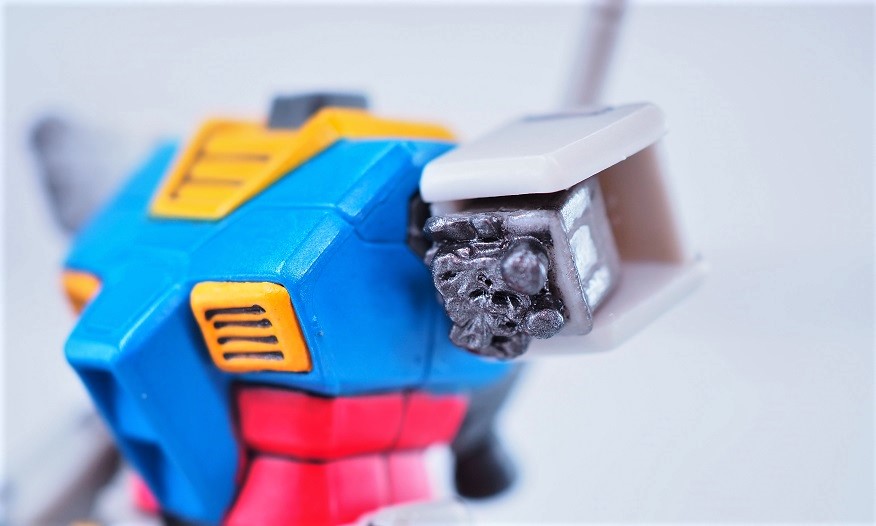 あらかじめ全身にすす焼けたような汚し塗装が施されたガンダム。
