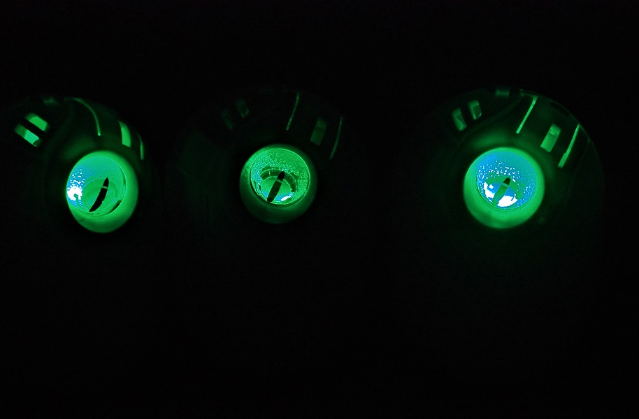目がグリーンに発光し、怪しい鳴き声のようなサウンドが鳴り響きます。