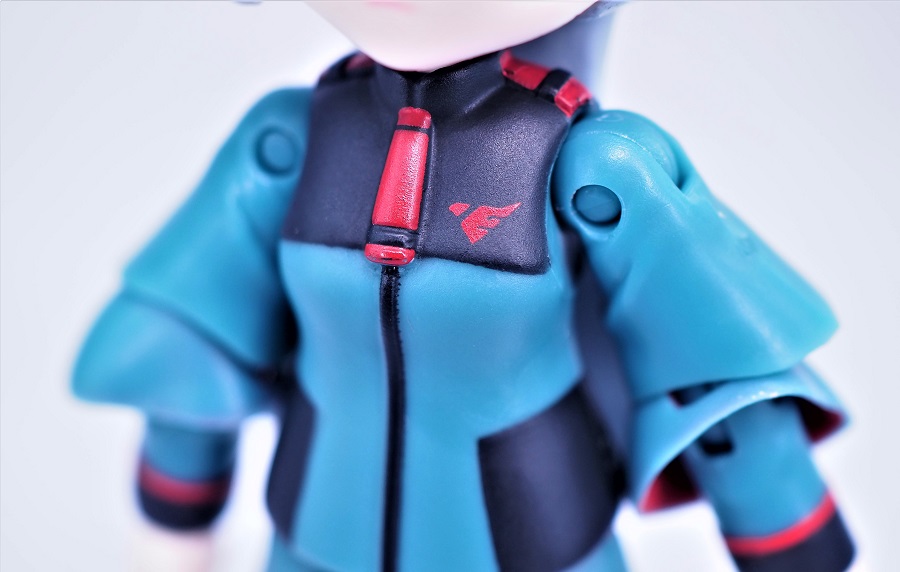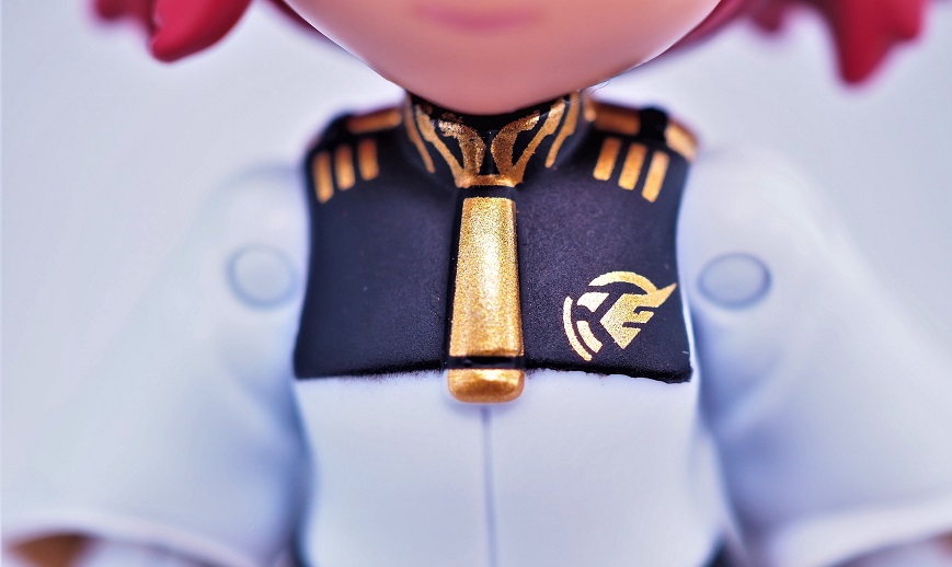 襟元の装飾や胸のマークは発色の良いゴールドのタンポ印刷で再現されています。
