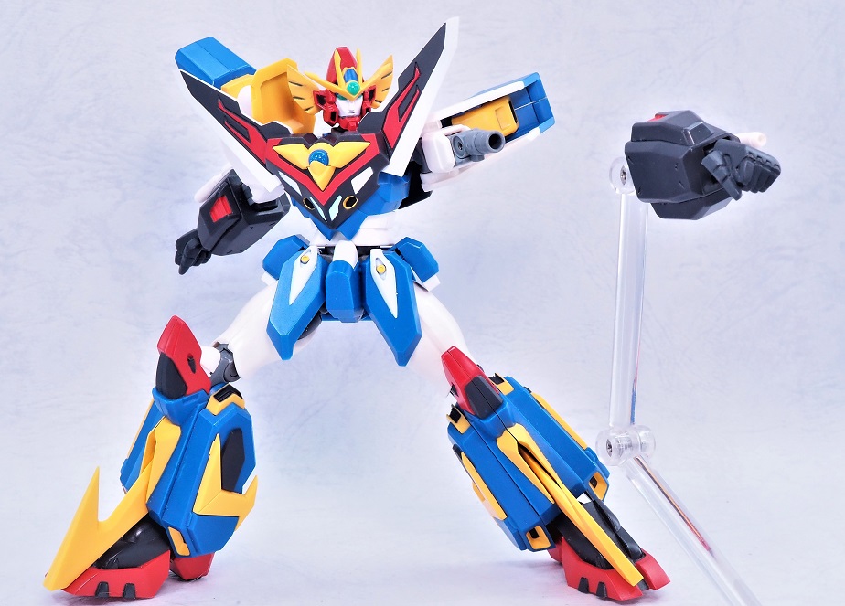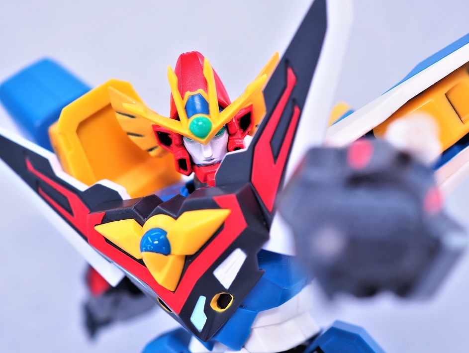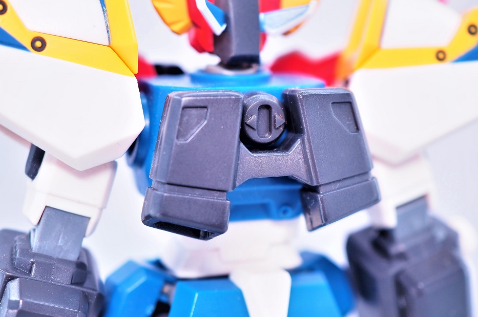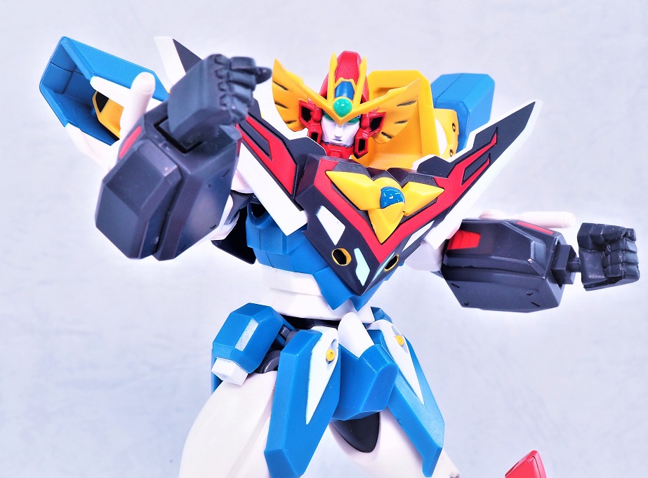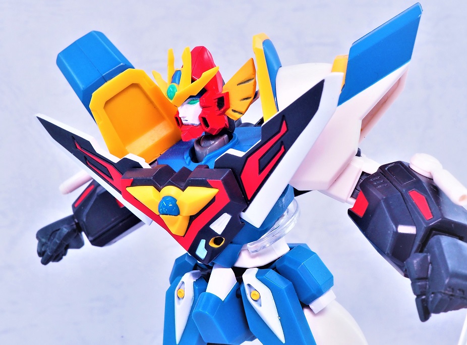 胸のウィングパーツを少し上に逃がすと、腕が当たることなく可動します。