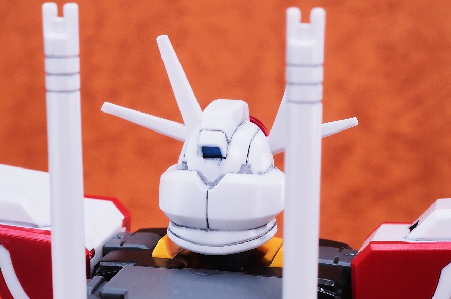 ツインアイ周りの黒い縁に当たる部分はパーツの隙間とその影による表現。