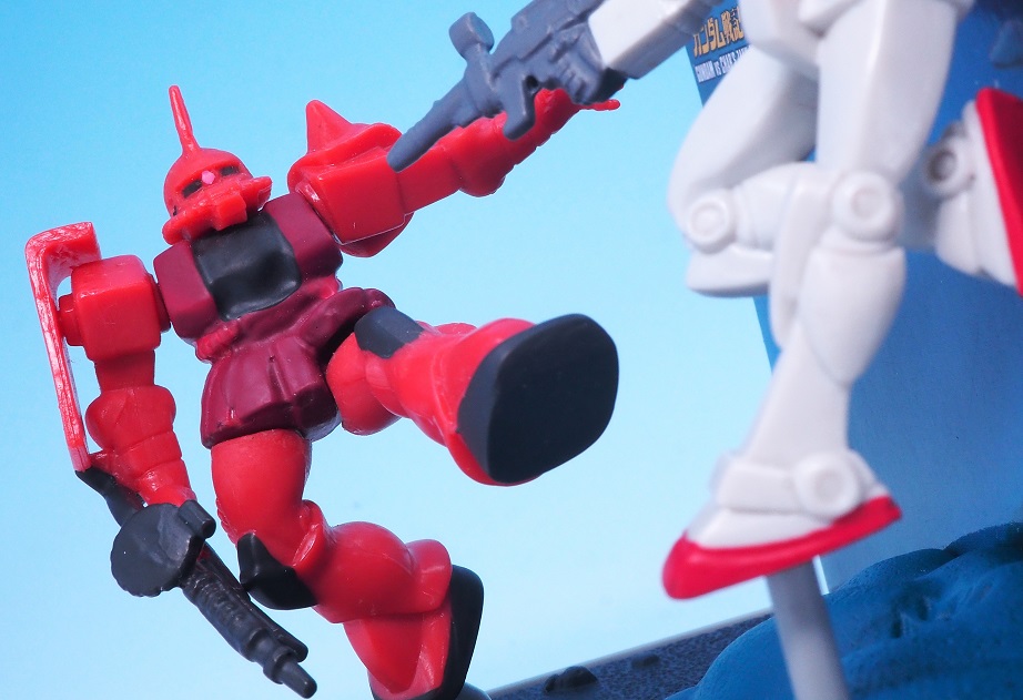 マシンガンを片手にガンダムに立ち向かうシャア。