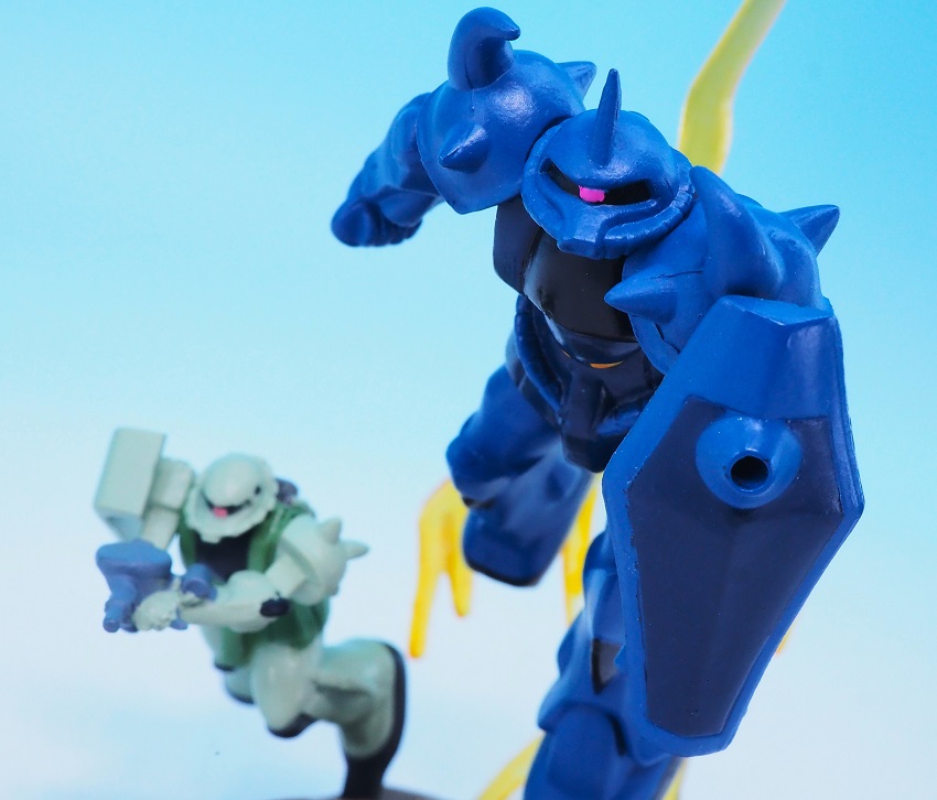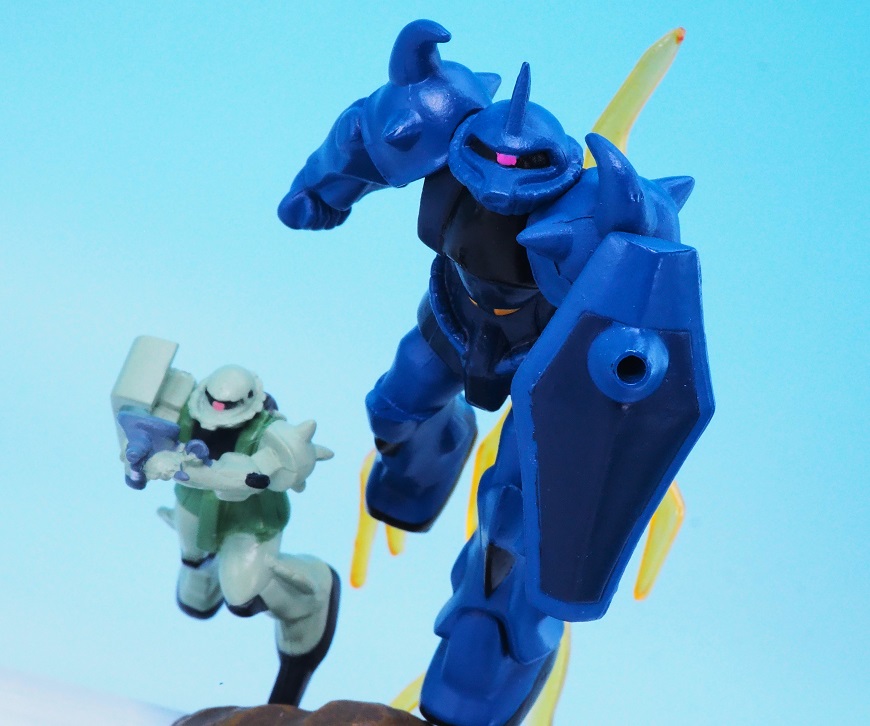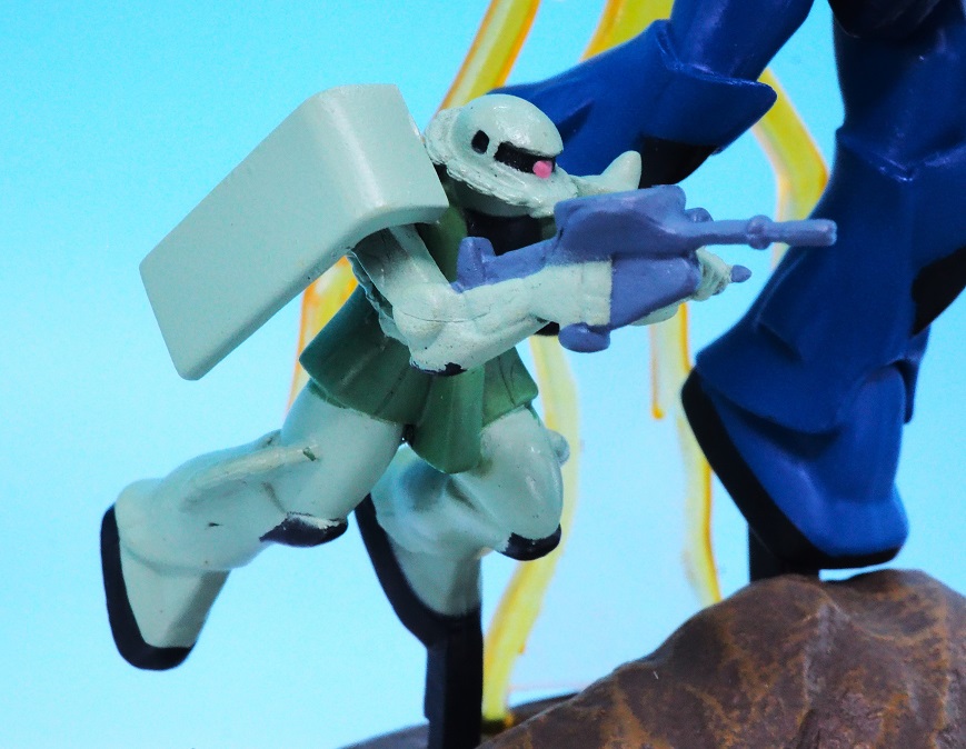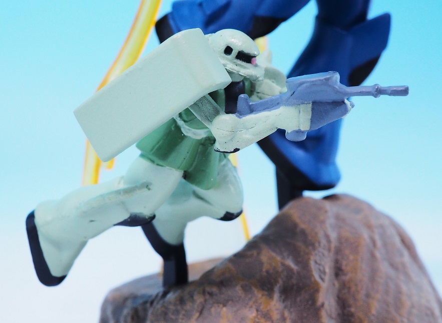後部のザクは遠近法の表現で小さく造形されているので、前からのアングルがベストになりますね。