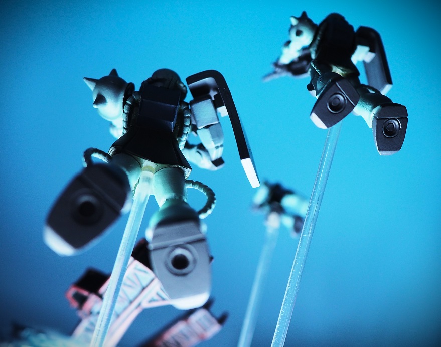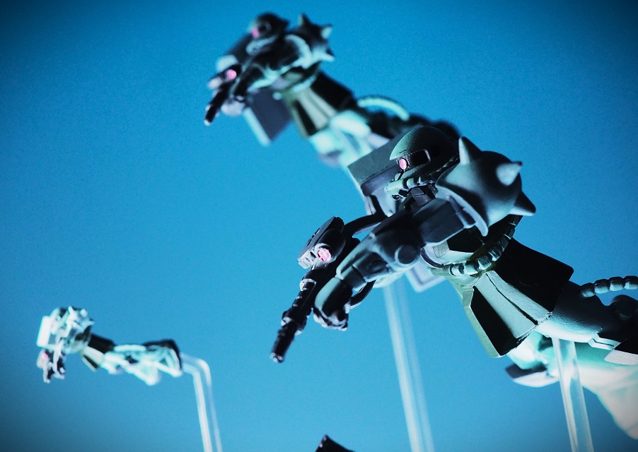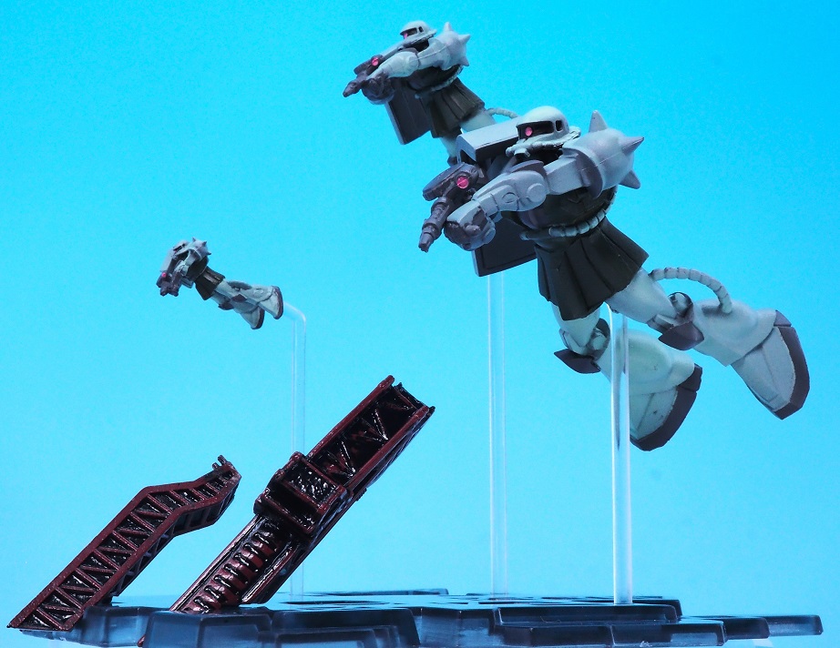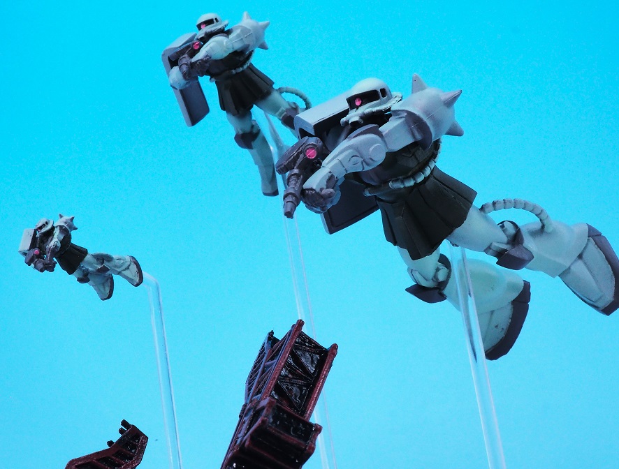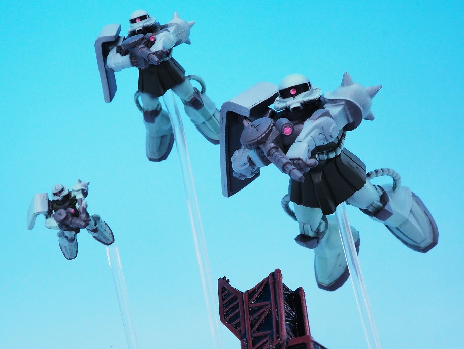 手前の一番大きいサイズのザクでマシンガンを構えたポージング。