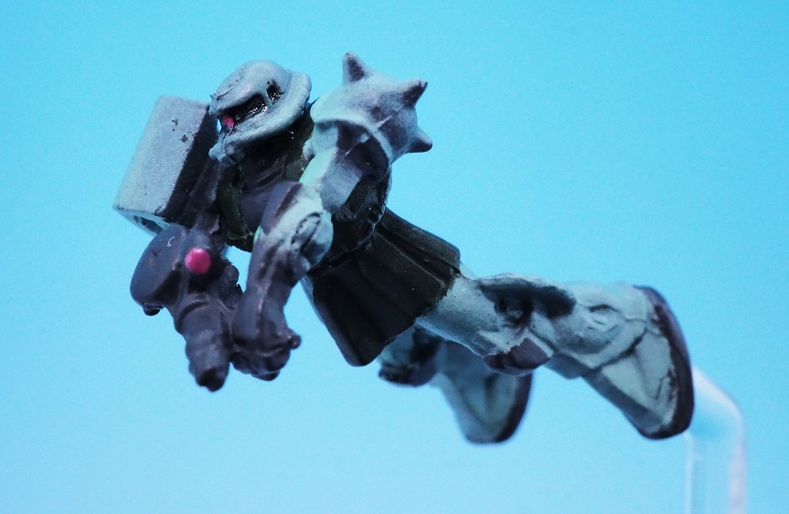 人間の小指の先程度のサイズですが、モノアイやマシンガンのスコープ部分など細かな塗装が施されております。