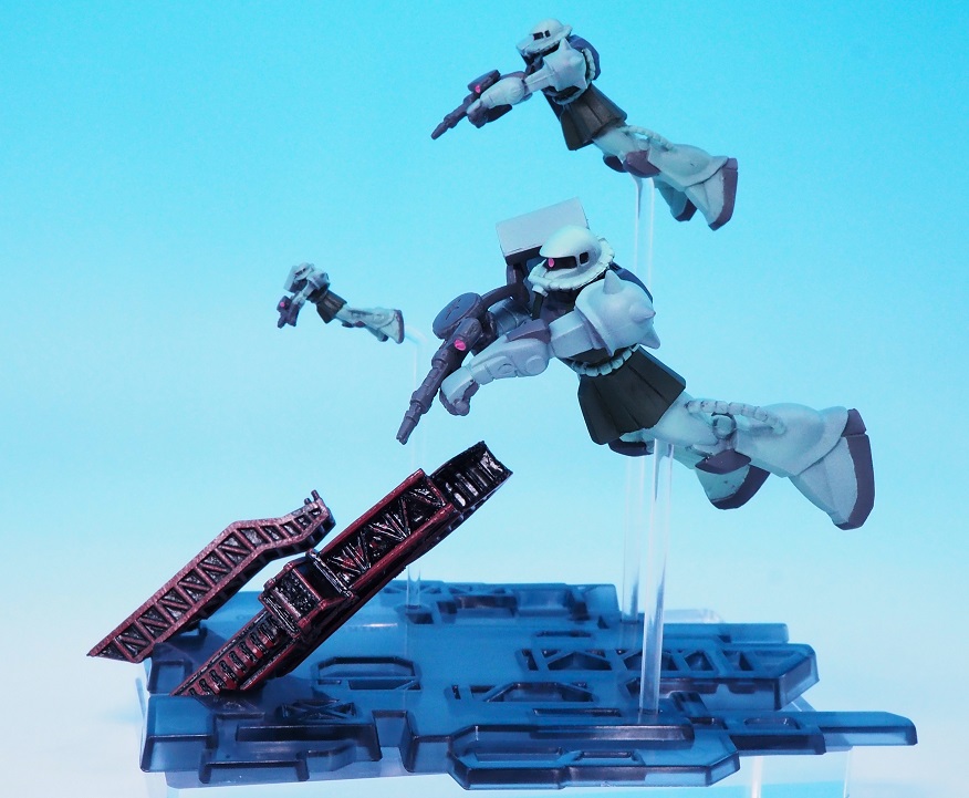 付属の支柱パーツを差し込んでザクをディスプレイする感じです。