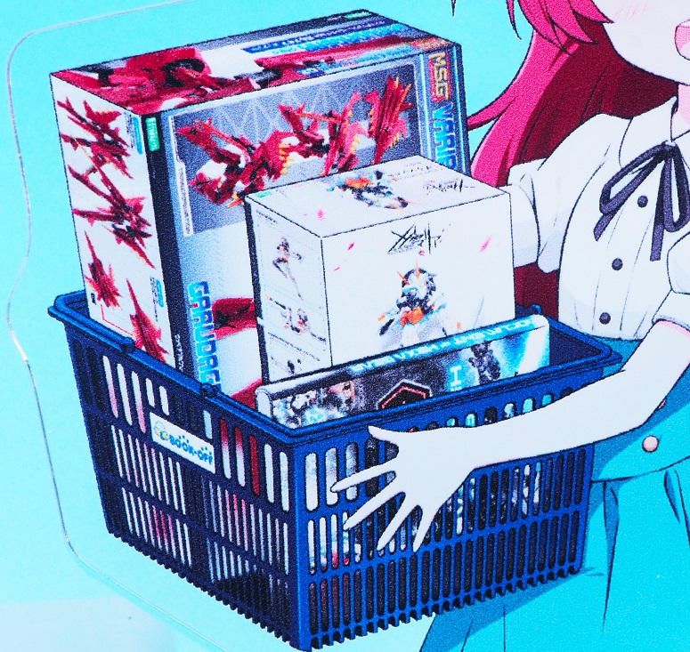 手にはブックオフのカゴに入ったコトブキヤのプラモデルたちの姿が。