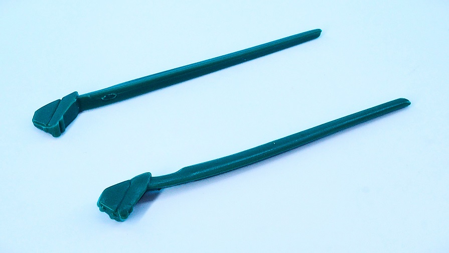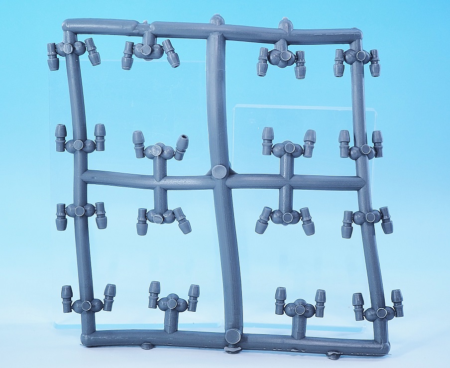 PVC成形のランナーに予備を含めた32個の砲身が付属しているので、切り取って本体に取り付けます。