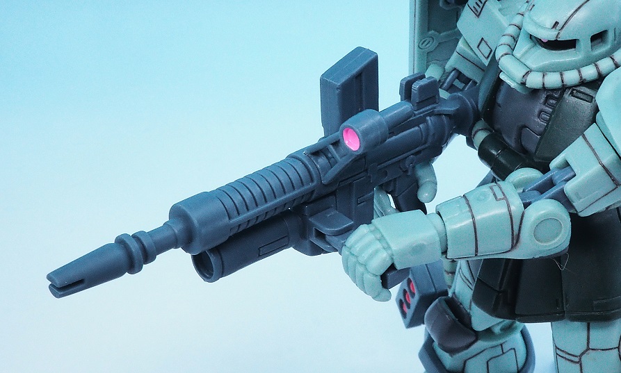 映像作品では「機動戦士ガンダム0083」に登場する武器なので本来MS-06が装備していないマシンガン。