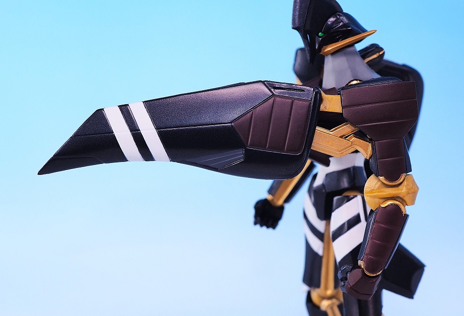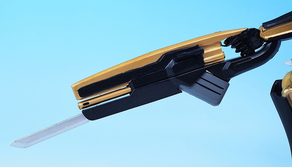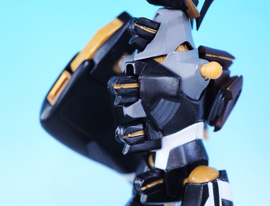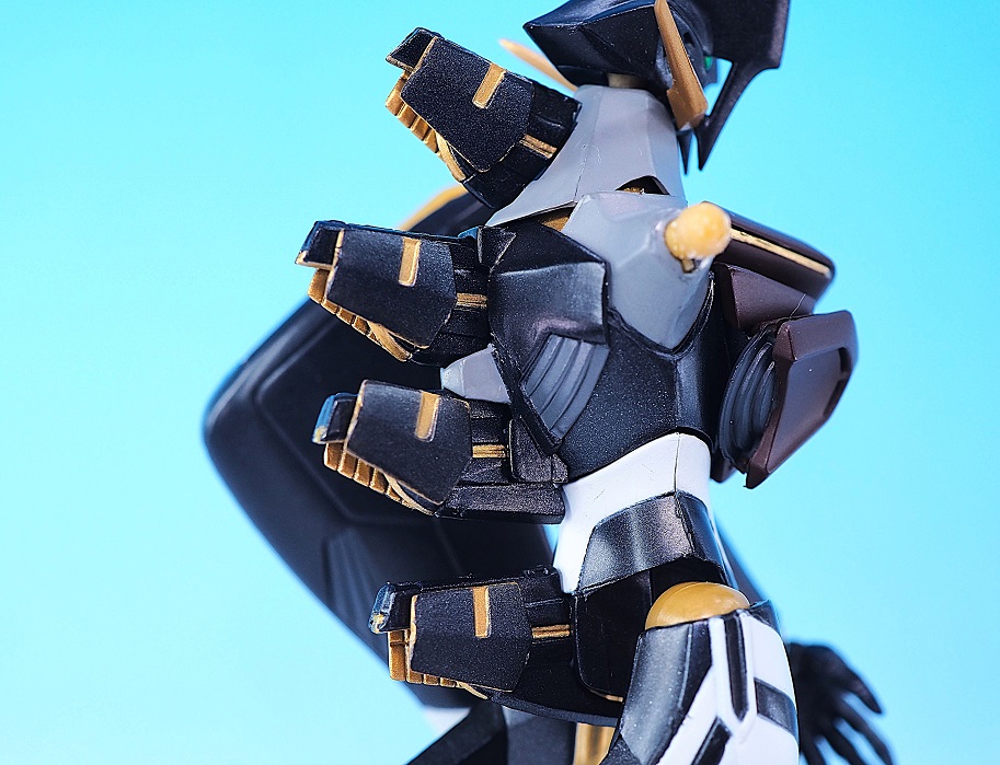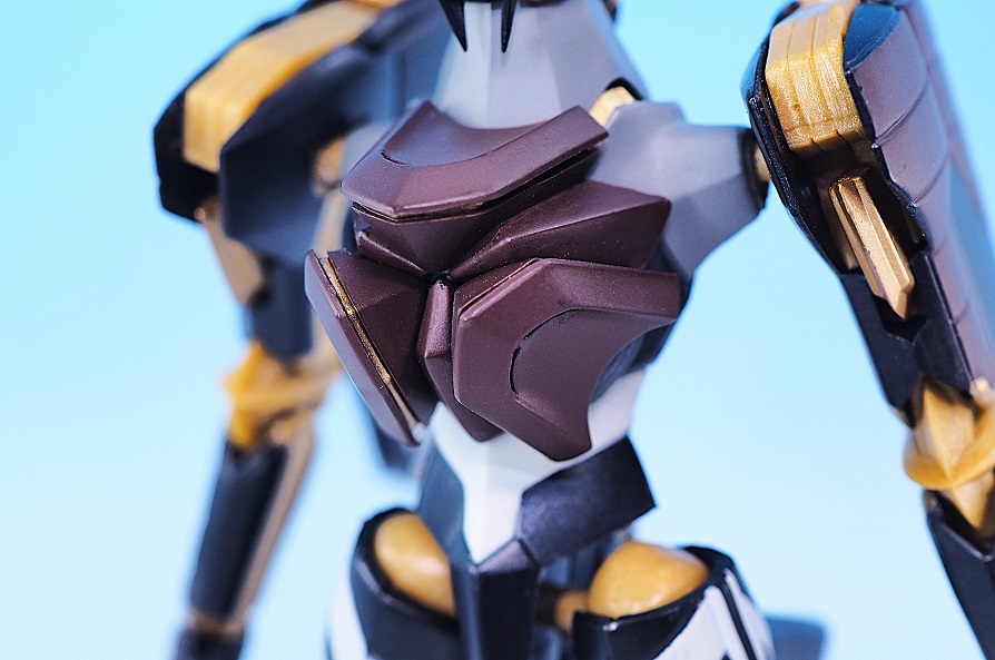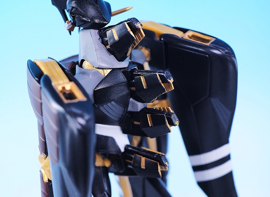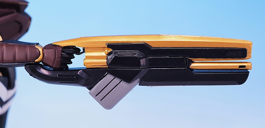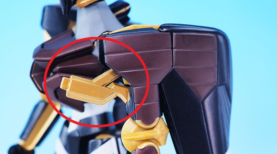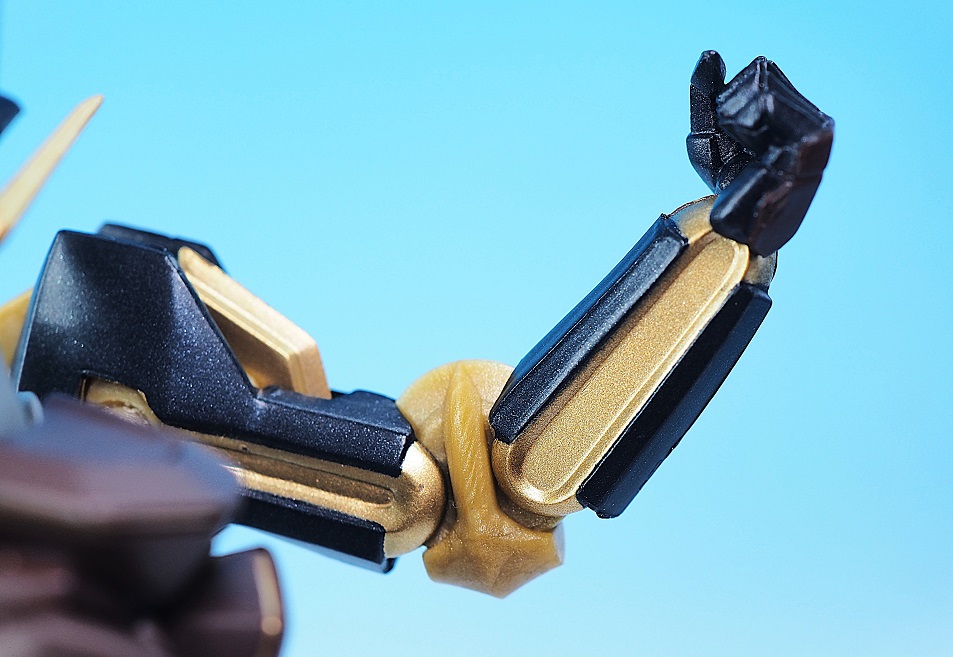 関節部は本来ならゴールドが正しい配色ですが、フィギュアでは可動を考えて黄土色の成形色になっています。