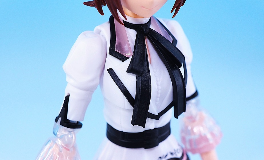 襟元はクリアピンクパーツでイラストの透け感を再現。