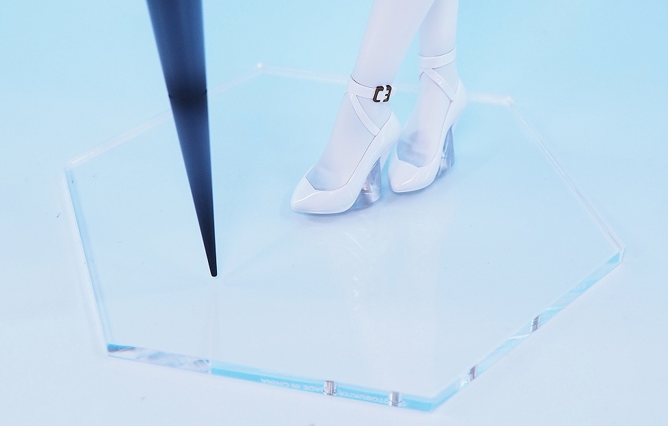 靴は光沢感のあるヒールでソックスとホワイトの色合いが異なります。