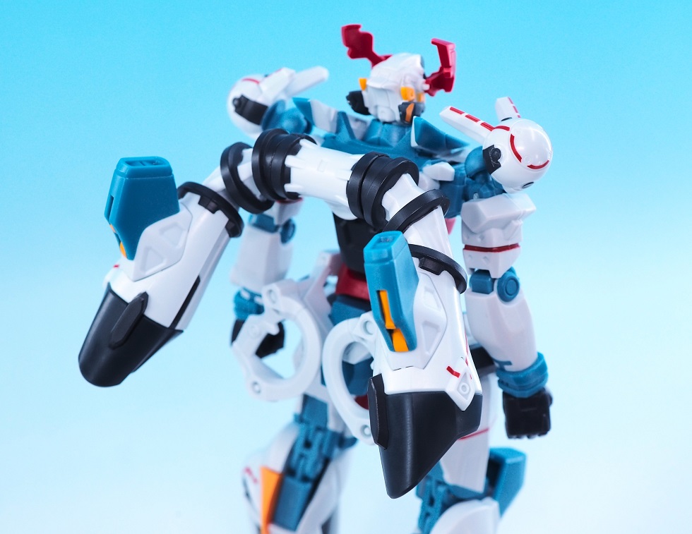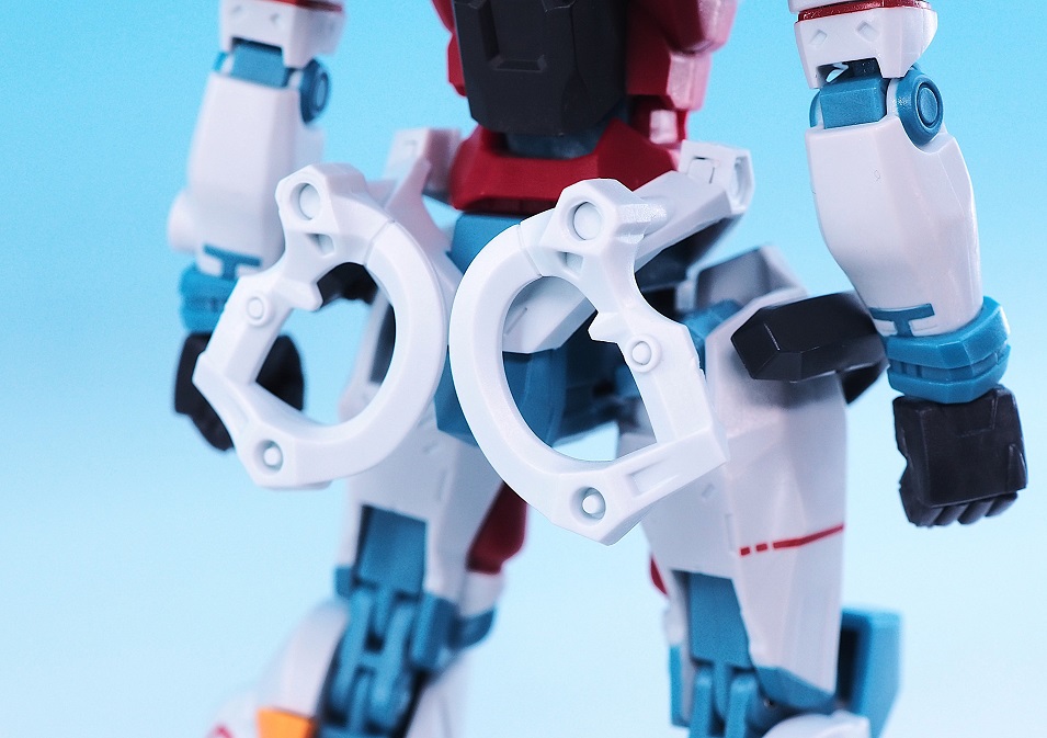 関節パーツはシリーズ共通の規格ですが、ジークアクスは露出したジョイント部が鮮やかなブルーの成形色に変更されています。