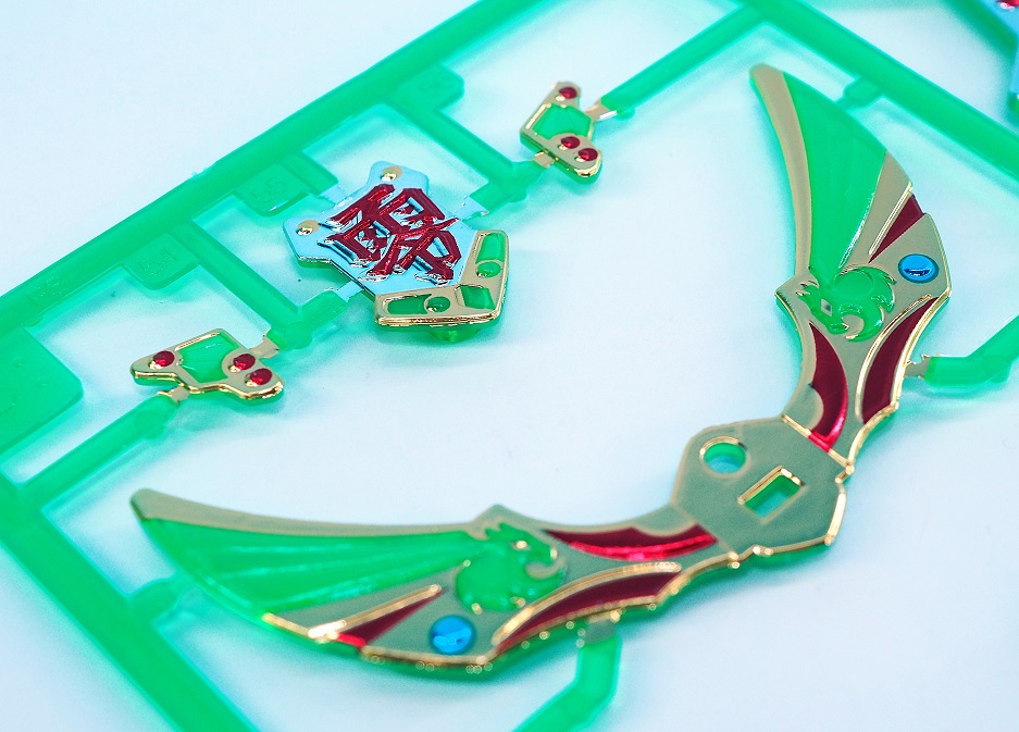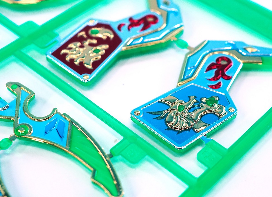 インモールド成形パーツでクリアグリーンの上にフルカラーメッキコーティングが施された特殊なランナー。