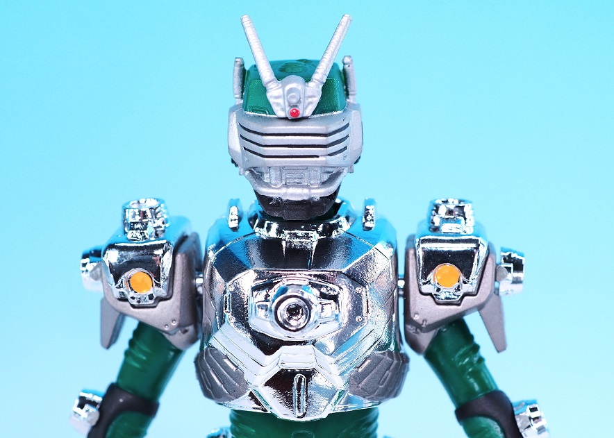 シルバーメッキの胸部パーツはプラスチック成型なのでカッチリとした仕上がり。