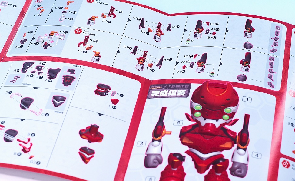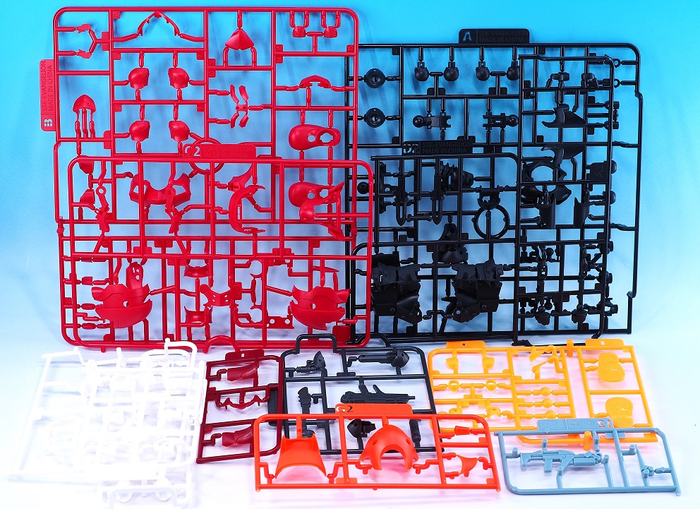 パーツ成形色は 赤、濃い赤、白、黒、グレー、ライトグレー、オレンジ、黄色 の8色。